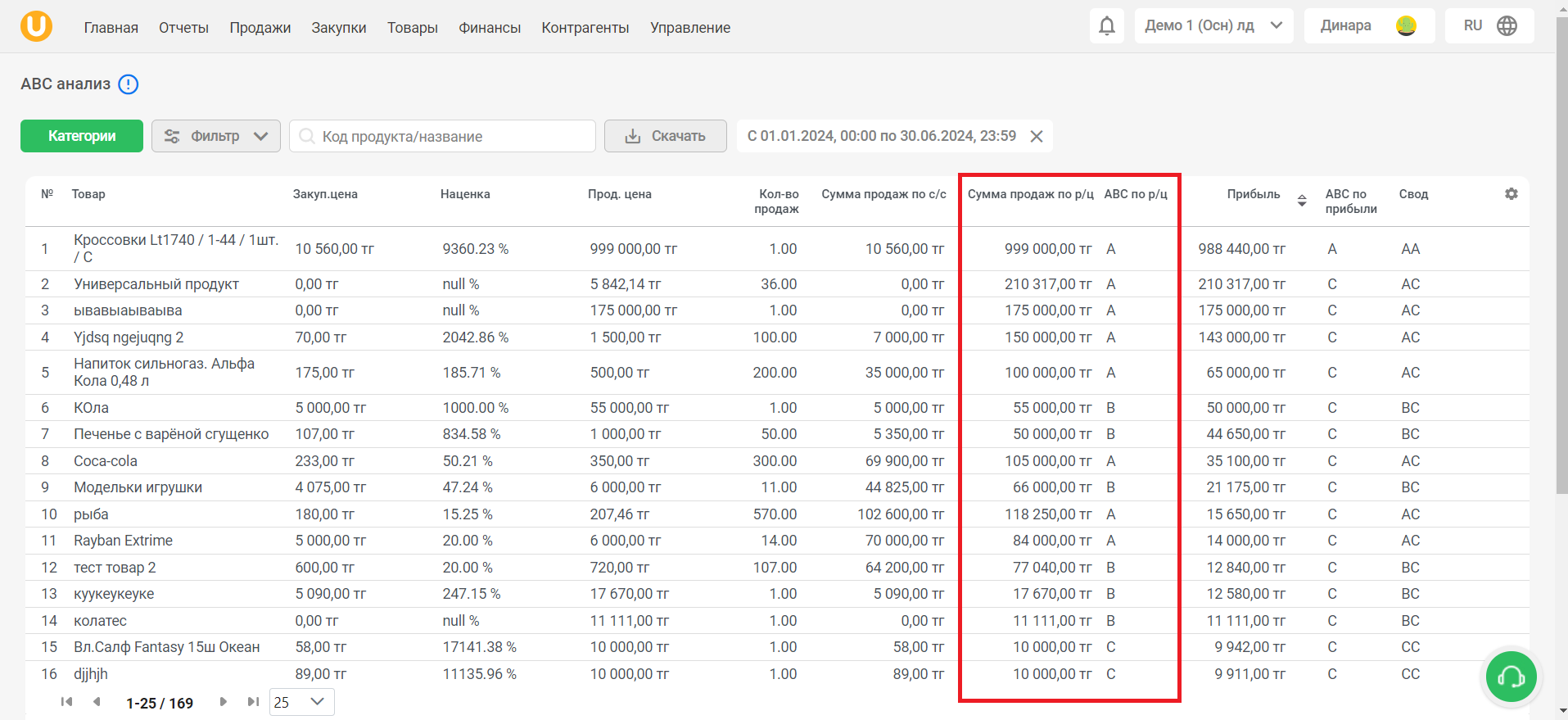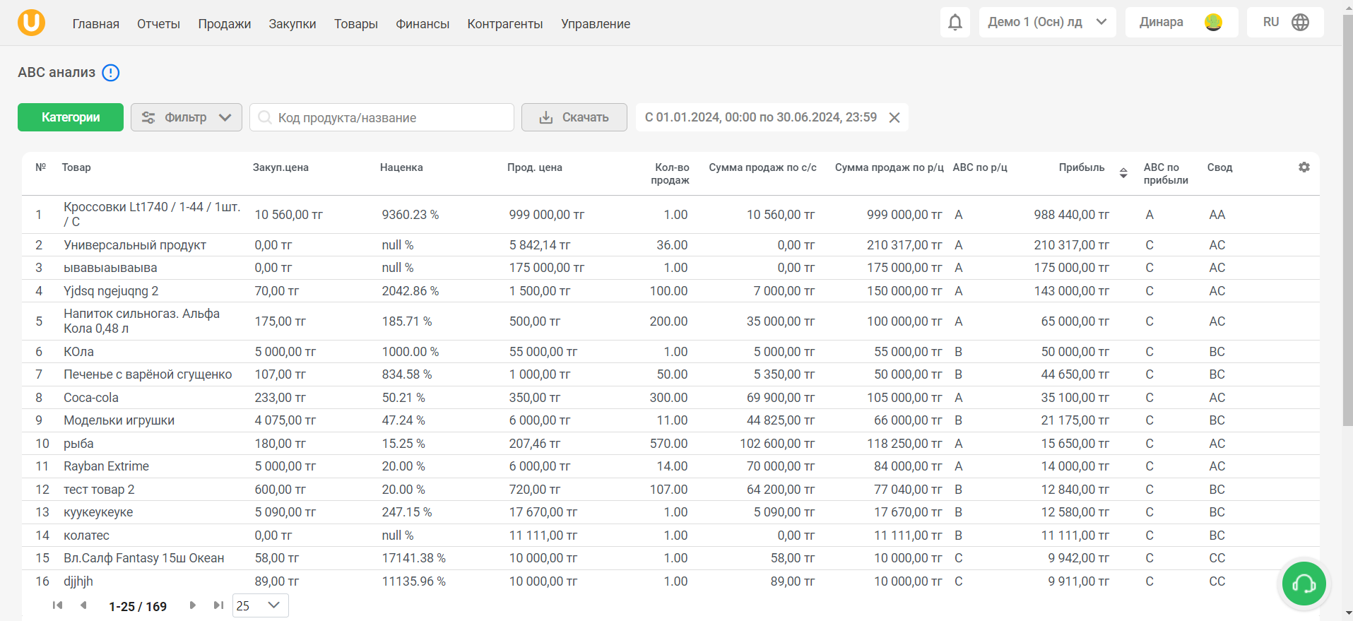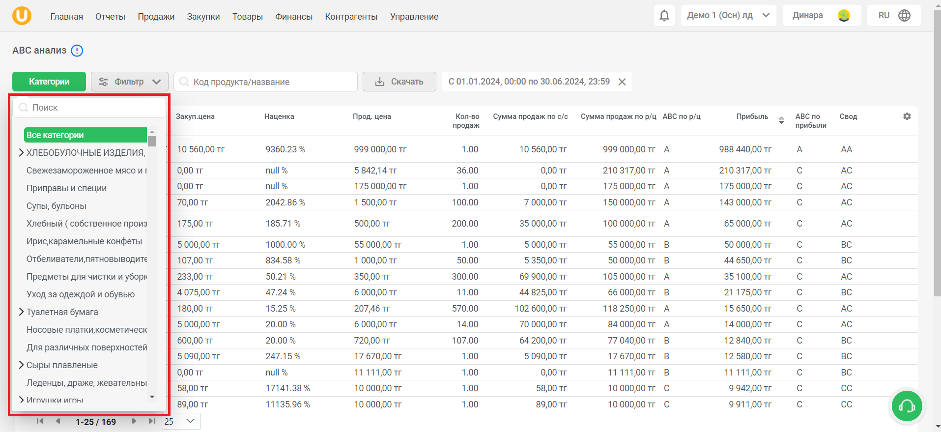 Откроется страница “ABC-анализ”. На этой странице вы можете увидеть таблицу ABC анализа, настроить категории товаров, которые вы хотите проанализировать, настроить фильтр, выполнить поиск товаров в таблице по коду/названию, а также экспортировать таблицу ABC-анализа.