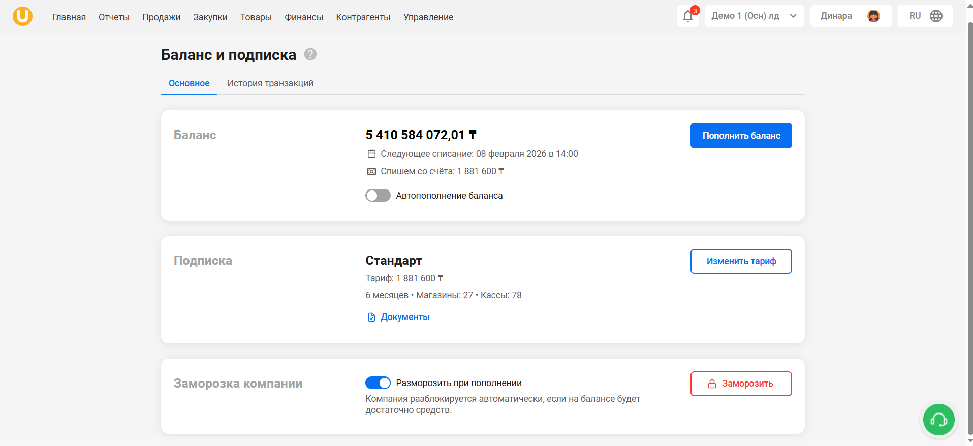Внимание! Заморозка компании приведет к закрытию всех магазинов, касс и пользователей!