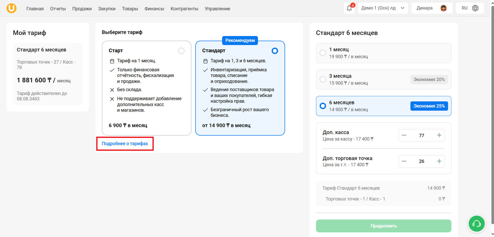 Вы можете увеличить количество касс или торговых точек, нажав на кнопку "➕", или уменьшить, нажав на кнопку "➖" в окне тарифа. Стоимость добавления каждой кассы или торговой точки составляет 2 900 тенге. Общая сумма ежемесячной оплаты изменится автоматически. После внесения изменений, нажмите кнопку "Продолжить".