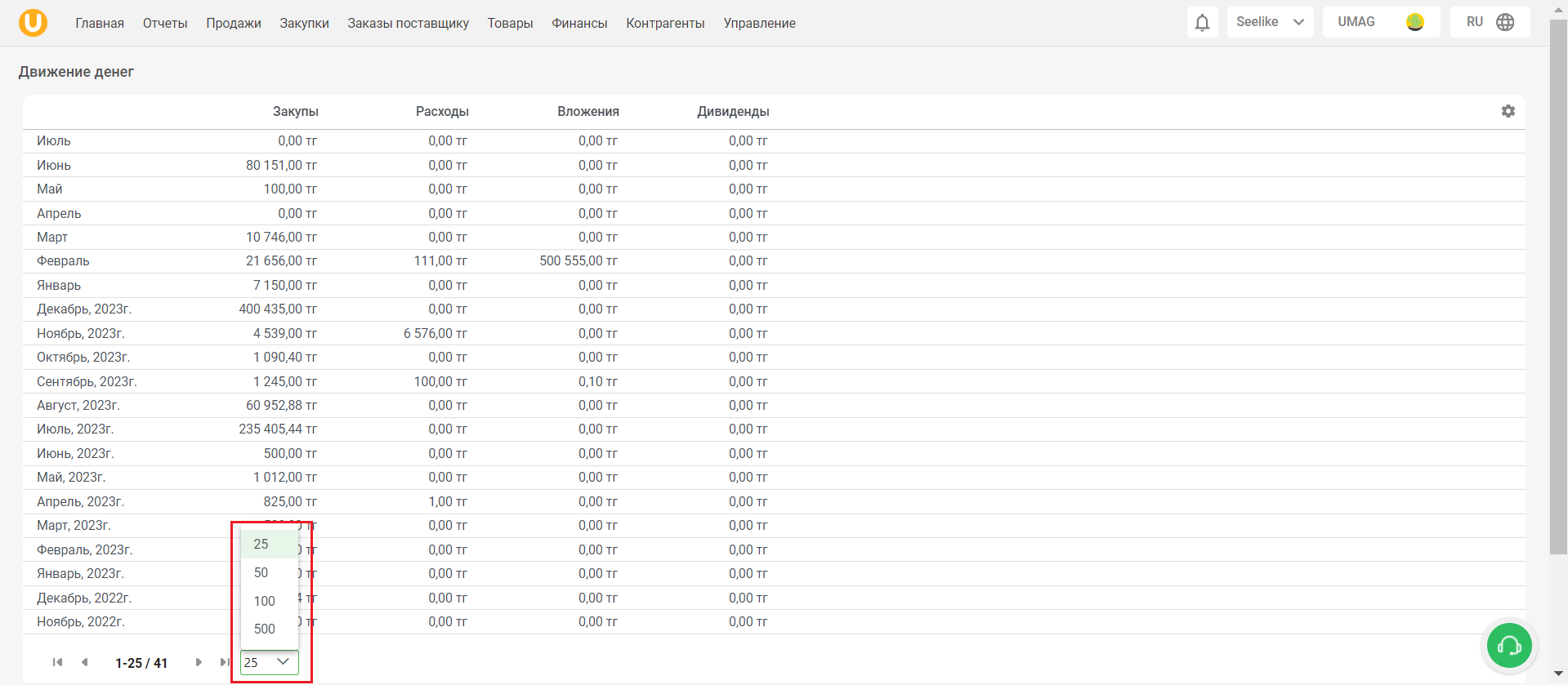 Чтобы перейти на страницу "Движение денег", откройте вкладку "Отчеты" в верхнем меню,затем в выпадающем списке выберите строку "Движение денег".