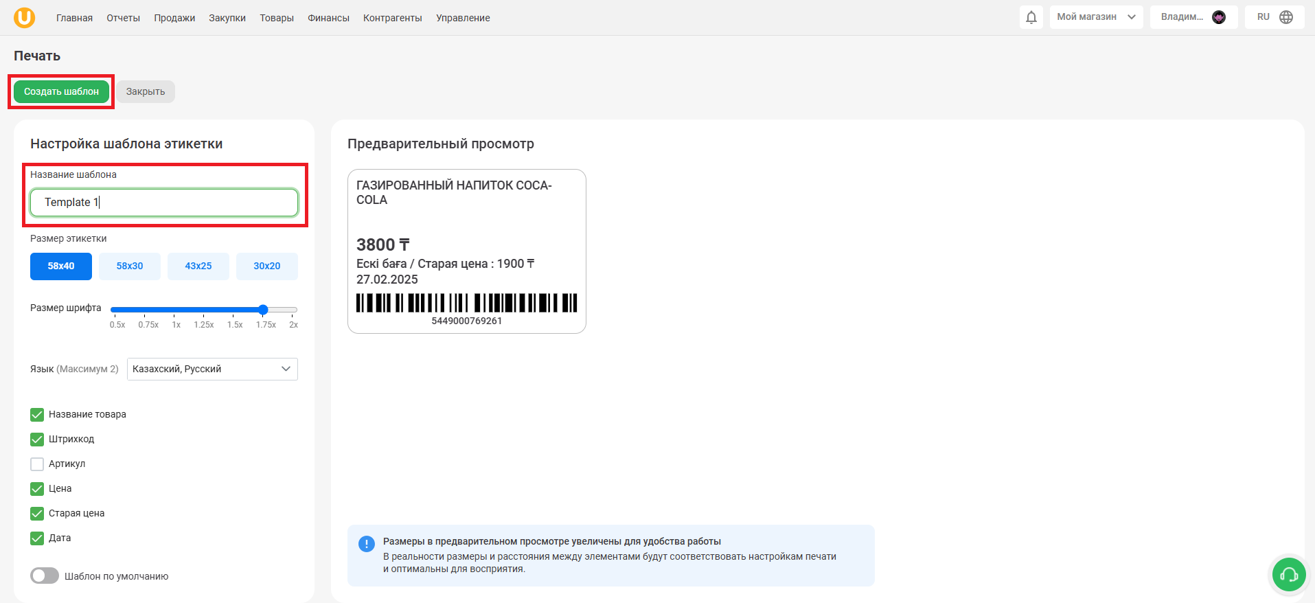 После завершения всех настроек, укажите название шаблона и нажмите на кнопку “Создать шаблон”, чтобы создать шаблон ценника.