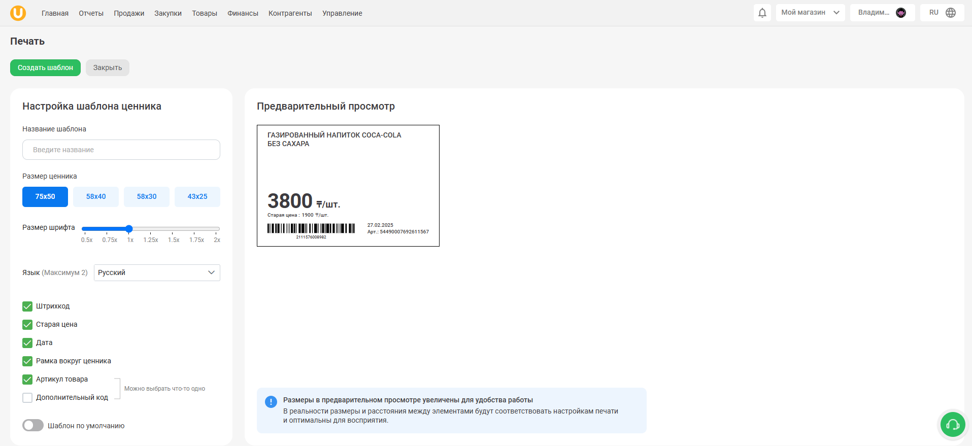 Для того, чтобы создать ценники для печати, перейдите во вкладку “Ценник”. На этой странице вы можете настроить содержимое созданных ценников и распечатать готовые ценники, а также создать новый шаблон для ценников.