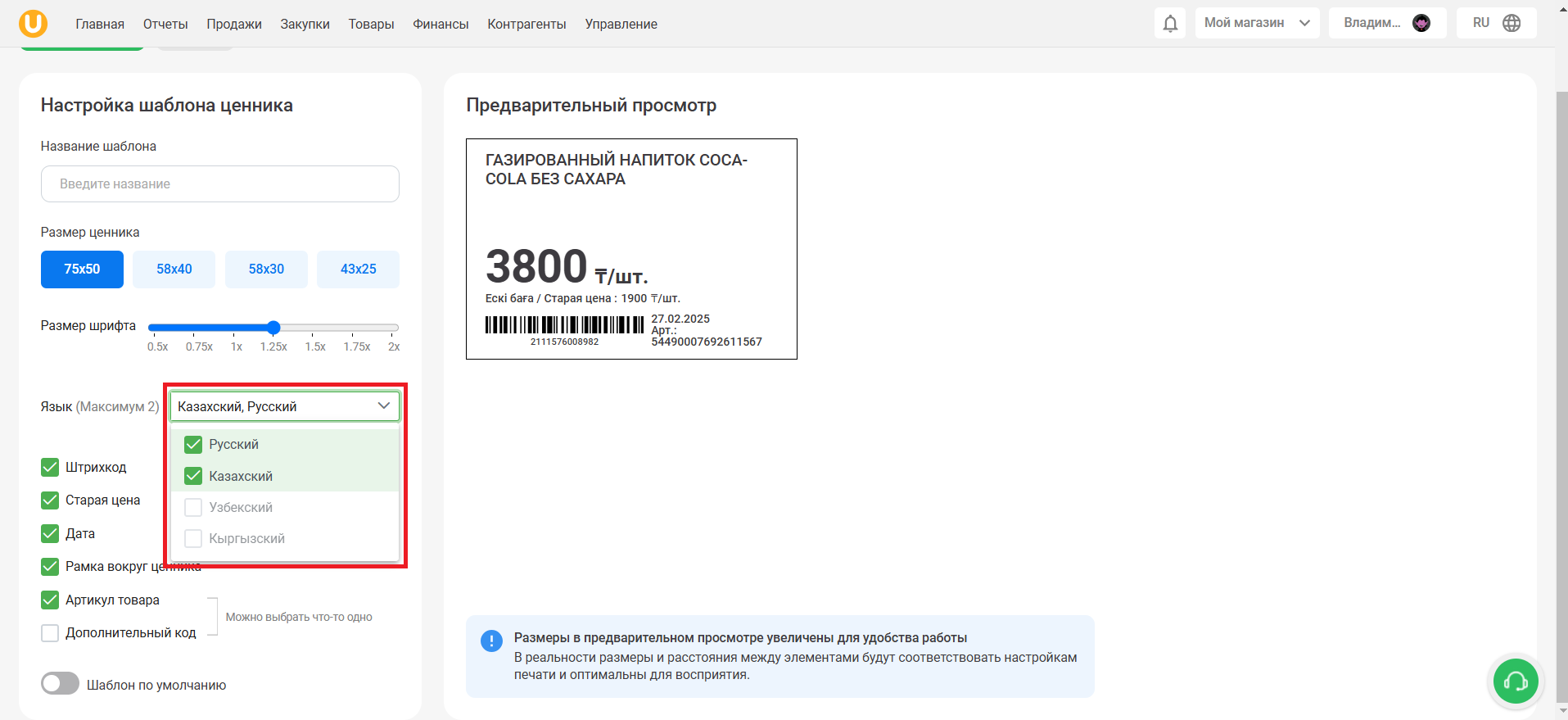 Настройте язык надписей на ценнике, выбрав необходимый язык в поле “Язык”. Для выбора доступны русский, казахский, узбекский и кыргызский языки. Важно отметить, что вы можете уместить на ценнике максимум 2 языка.