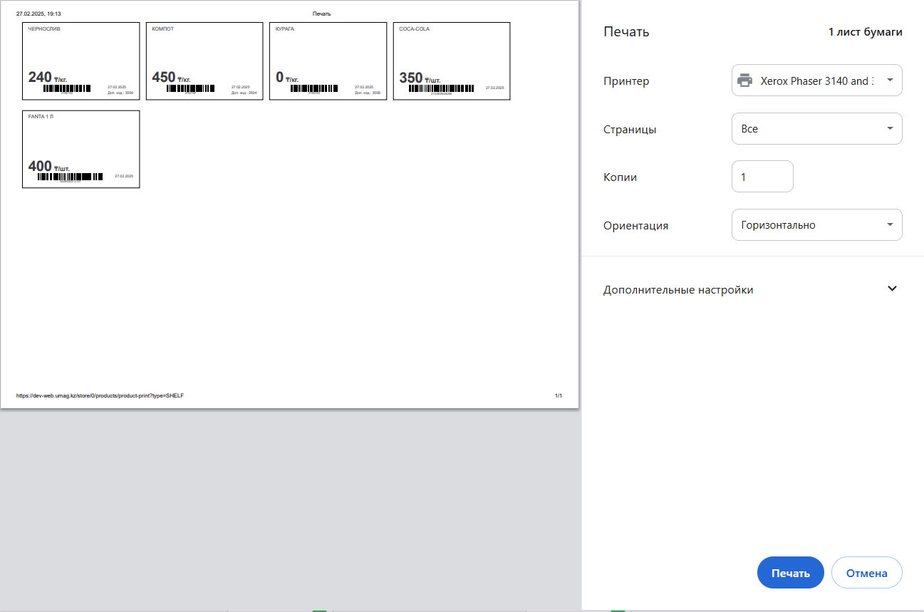В открывшемся окне печати выберите ваш принтер, укажите страницы, количество копий, ориентацию листа, внесите необходимые дополнительные настройки и нажмите на кнопку “Печать”, чтобы распечатать этикетки/ценники.