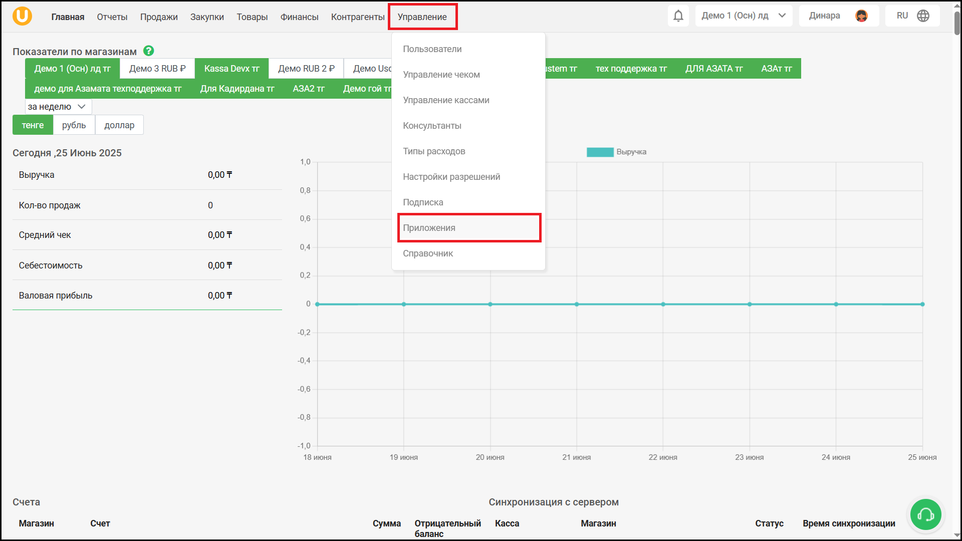 Для того, чтобы интегрировать веб-кассу в вашу учетную запись, перейдите в раздел “Подписка”. Для этого в верхнем меню выберите “Управление” → “Приложения”.