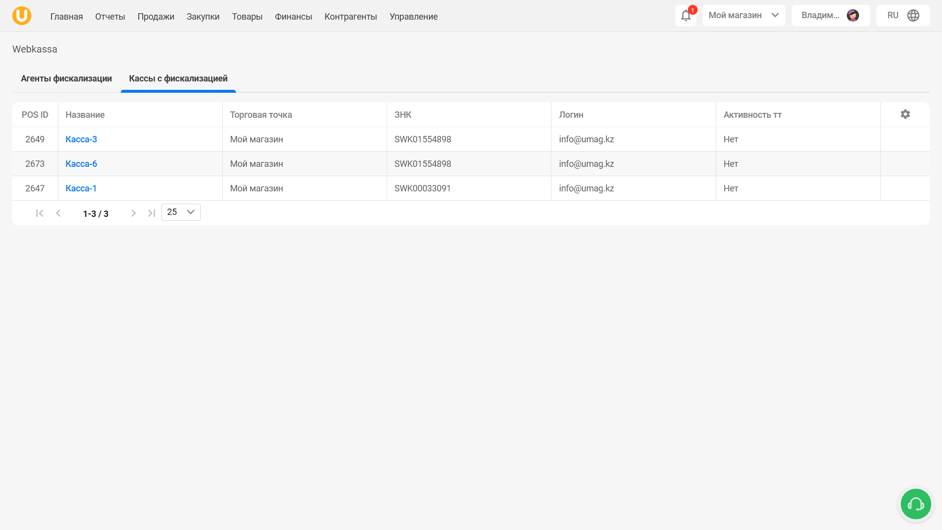Нажмите на вкладку “Кассы с фискализацией”. Откроется вкладка, в которой вы можете увидеть таблицу касс с фискализацией. Таблица касс с фискализацией содержит информацию об этих кассах: POS ID, название, торговая точка, заводской номер кассы, логин, активность торговой точки.