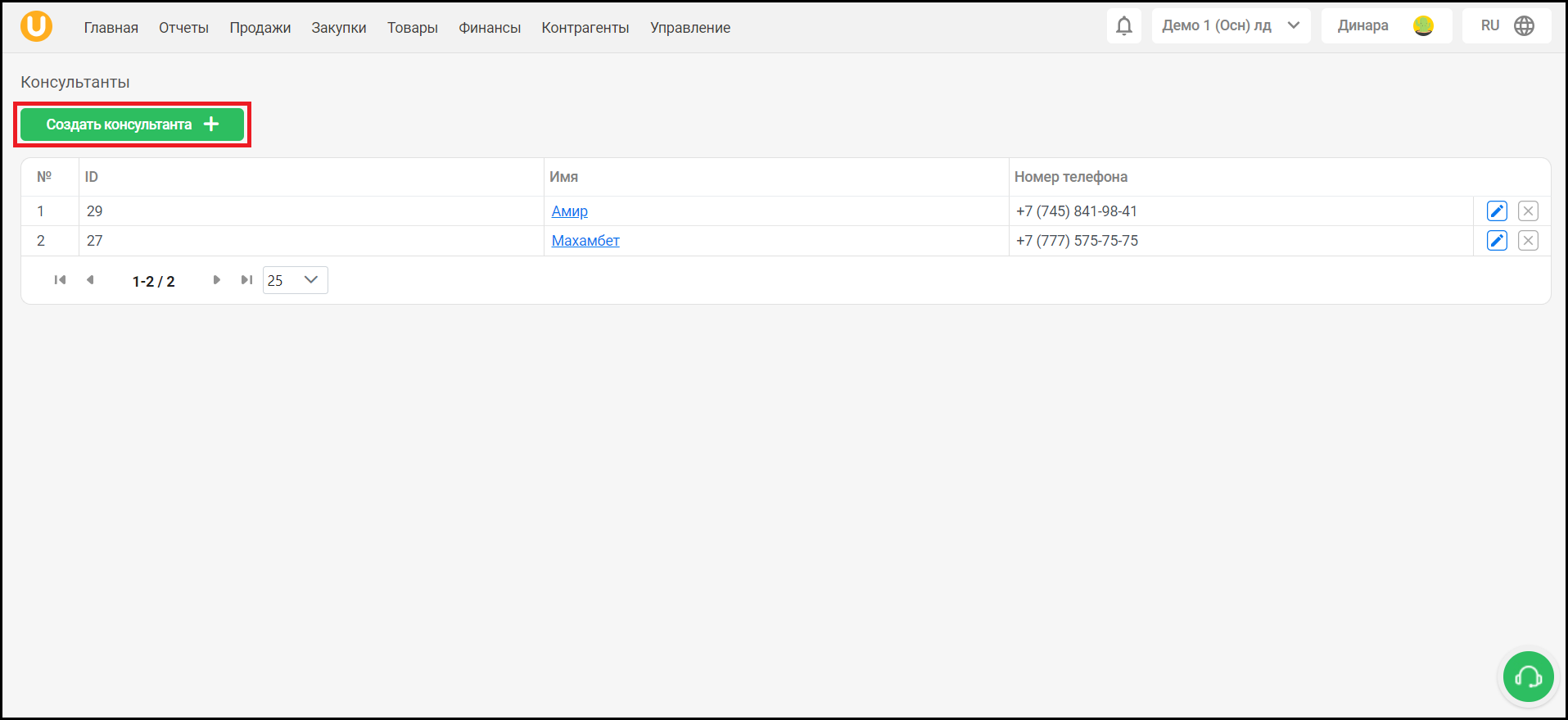 Откроется страница “Консультанты”. На данной странице вы можете увидеть список созданных консультантов, а также создавать, редактировать и удалять консультантов.