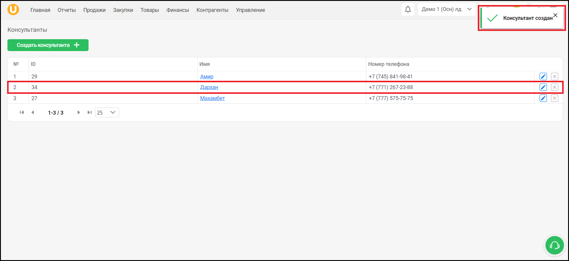 При успешном удалении консультант в списке исчезнет, а вы увидите уведомление в правом верхнем углу экрана.