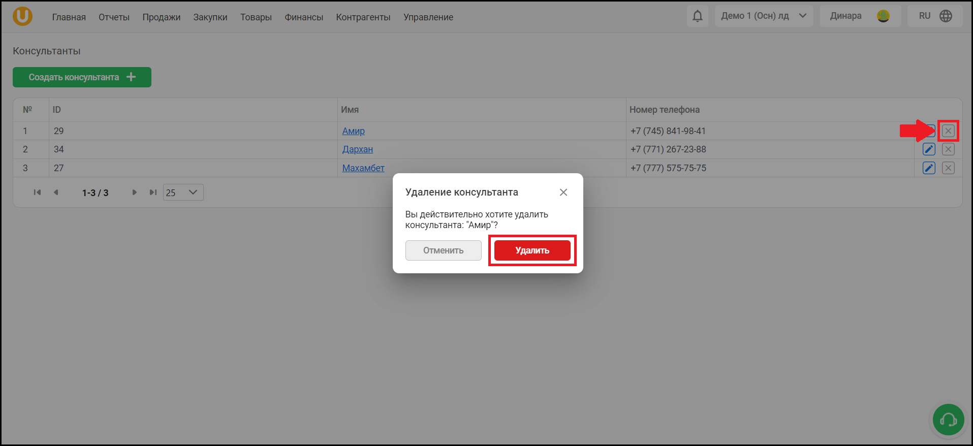 Для того, чтобы удалить консультанта, нажмите на кнопку “❌” в списке. В открывшемся окне подтвердите действие, нажав на кнопку “Удалить”.