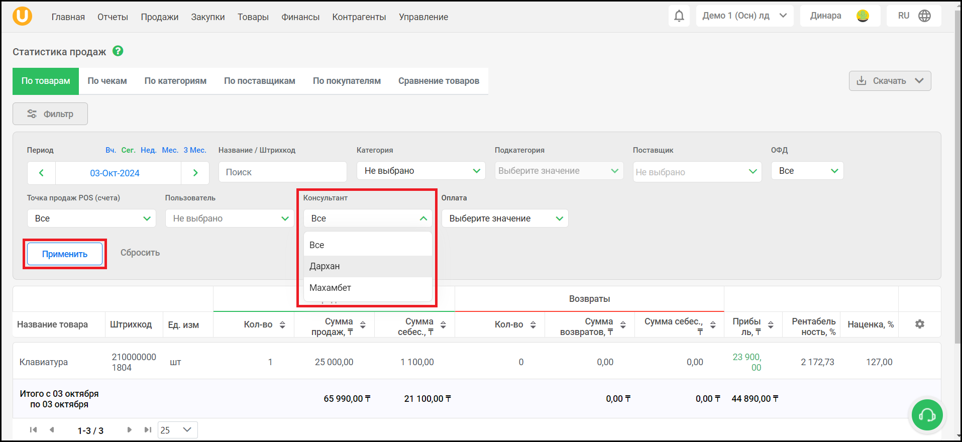 Откроется страница “Статистика продаж”, вкладка “По товарам”. Для того, чтобы просмотреть продажи определенного консультанта по товарам, в фильтре, в поле “Консультант” выберите консультанта и нажмите на кнопку “Применить”, чтобы применить фильтр. При необходимости, настройте прочие фильтры (см. инструкцию по статистике продаж).