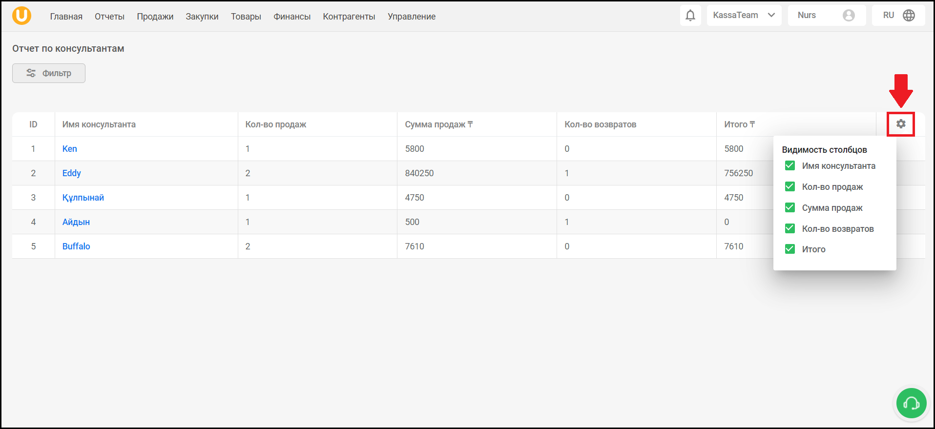 После, в нижней части страницы вы увидите таблицу с продажами/возвратами определенного консультанта.