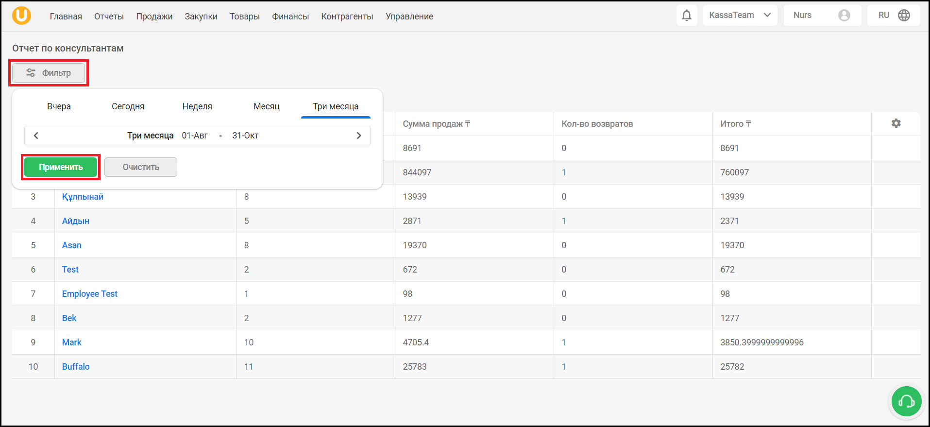 Откроется страница “Отчет по консультантам”. На данной странице вы можете увидеть список консультантов, количество их продаж, суммы продаж, количество возвратов и итоговую сумму.