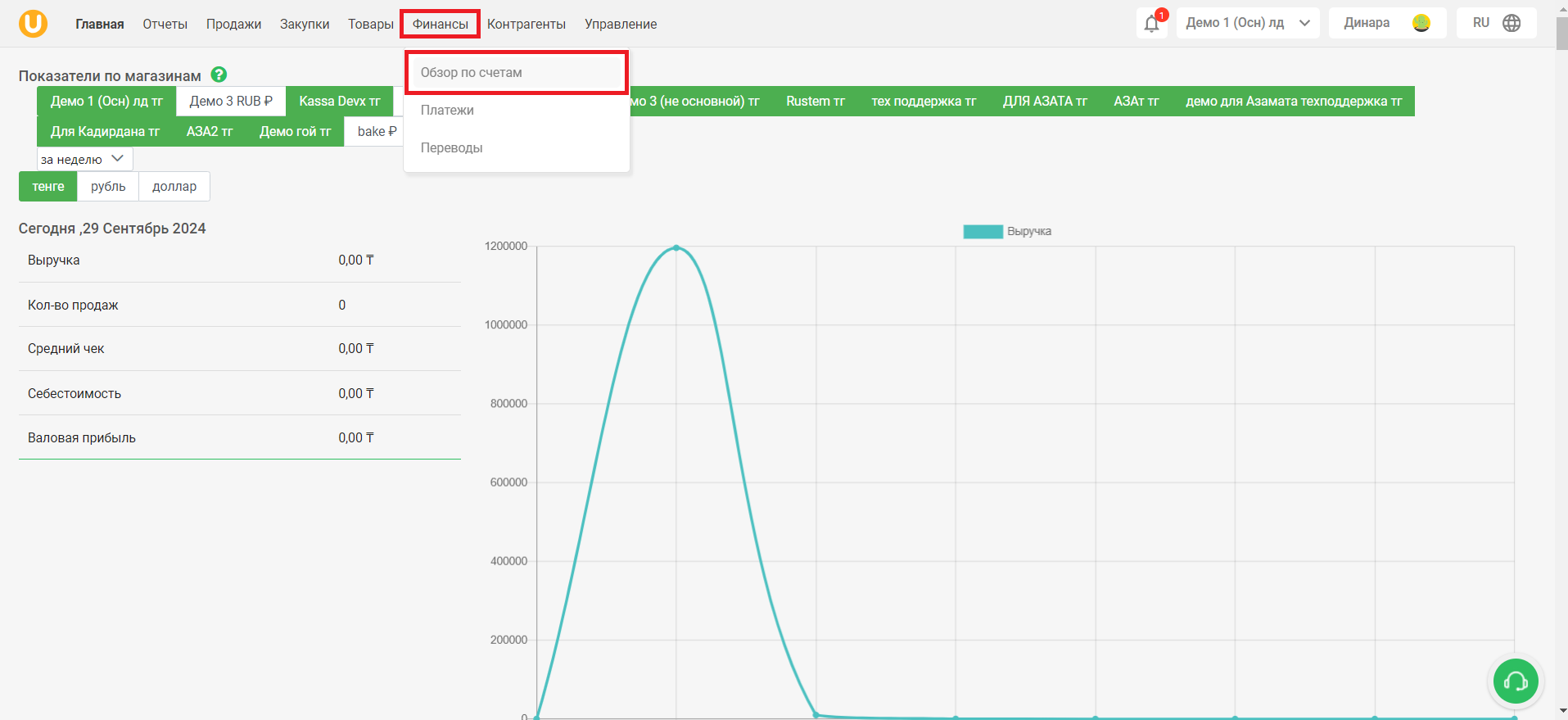 Раздел "Обзор по счетам" включает в себя информацию о счетах вашего магазина в системе UMAG. Этот перечень предназначен для учета ваших финансов на торговой точке. Для того, чтобы перейти в раздел “Обзор по счетам”, в верхнем меню выберите “Финансы” → “Обзор по счетам”.