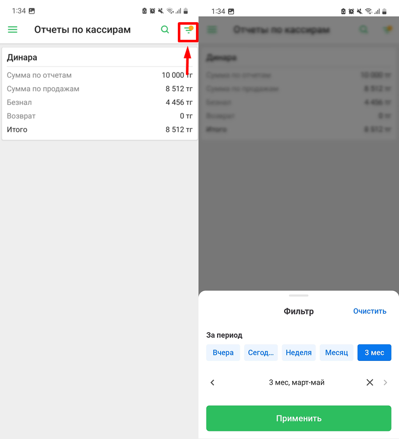 Чтобы выбрать отображение информации за определенный период нажмите на кнопку “Фильтр”. Отчеты по кассирам строятся помесячно, вы можете выбрать интересующий вас месяц и нажать на кнопку “Применить”.