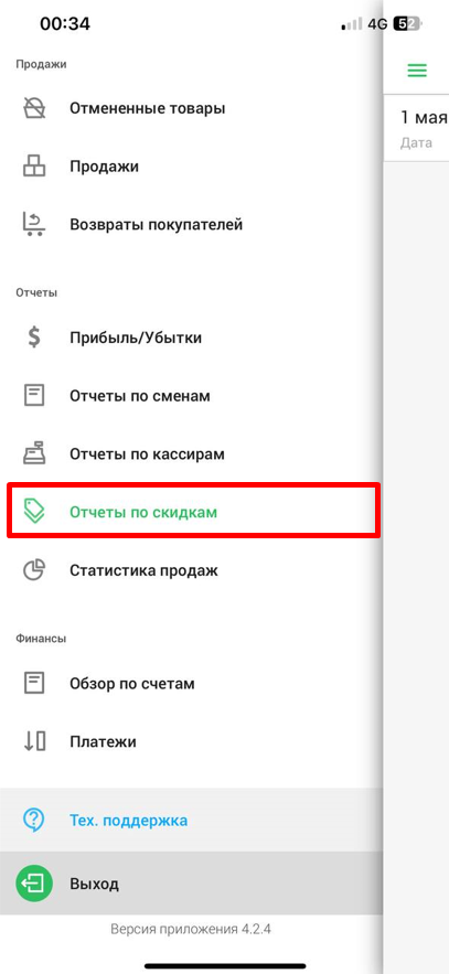 Чтобы перейти на страницу "Отчеты по скидкам", откройте боковое меню, затем в разделе "Отчеты" выберите строку "Отчеты по скидкам".