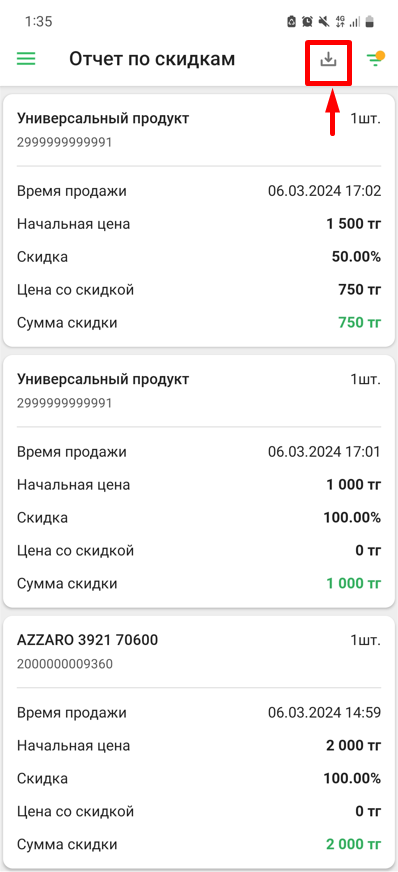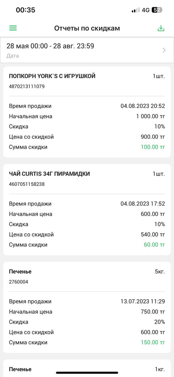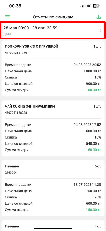 Перед вами появится список товаров продажа по которым проводилась с предоставлением скидок в вашей торговой точке за определенный период. Отчет по скидкам представлен в табличном виде с следующими столбцами: