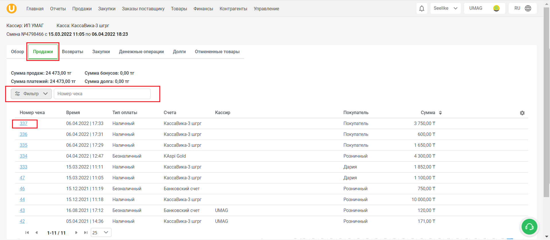 Этот раздел предоставляет информацию о продажах за смену. Перед вами появится список чеков продажи за смену. В списке уникальный номер чека, дата и время продажи, способ оплаты и покупатель.