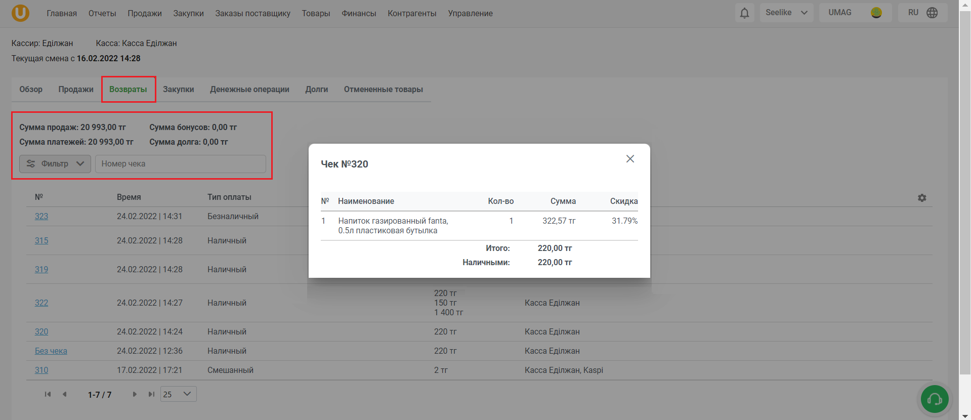 На этой вкладке вы найдете информацию о возвратах за смену. Здесь такой же функционал, как на вкладке "Продажи", но без информации о кассирах и покупателях. Также здесь есть поиск и фильтры по периоду и типу оплаты.