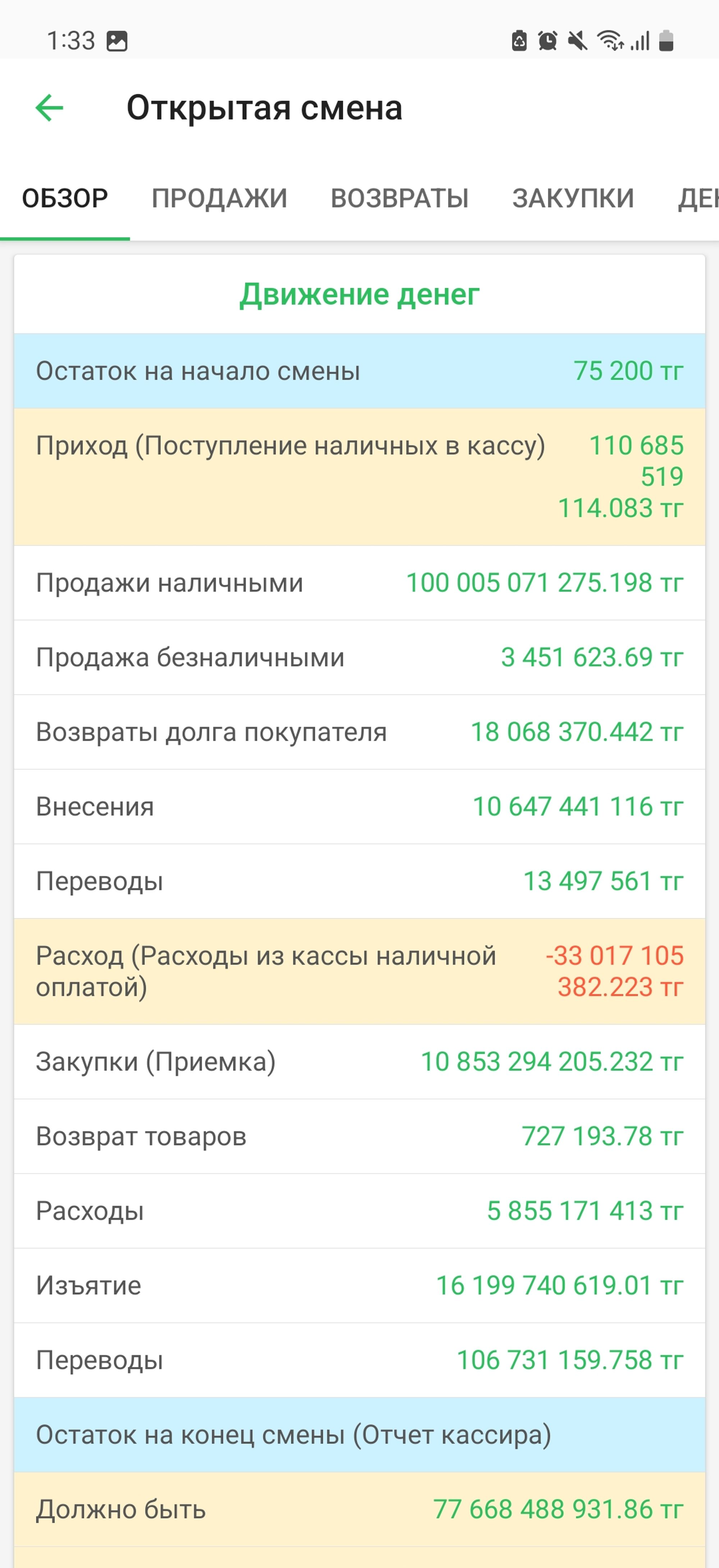 После чего перед вами откроется страница с общей информацией за смену. В верхней части данной страницы вы можете переключать по следующим вкладкам: “Обзор”, “Продажи”, “Возвраты”, “Закупки”, “Денежные операции”, “Долги”, “Отмененные товары”.