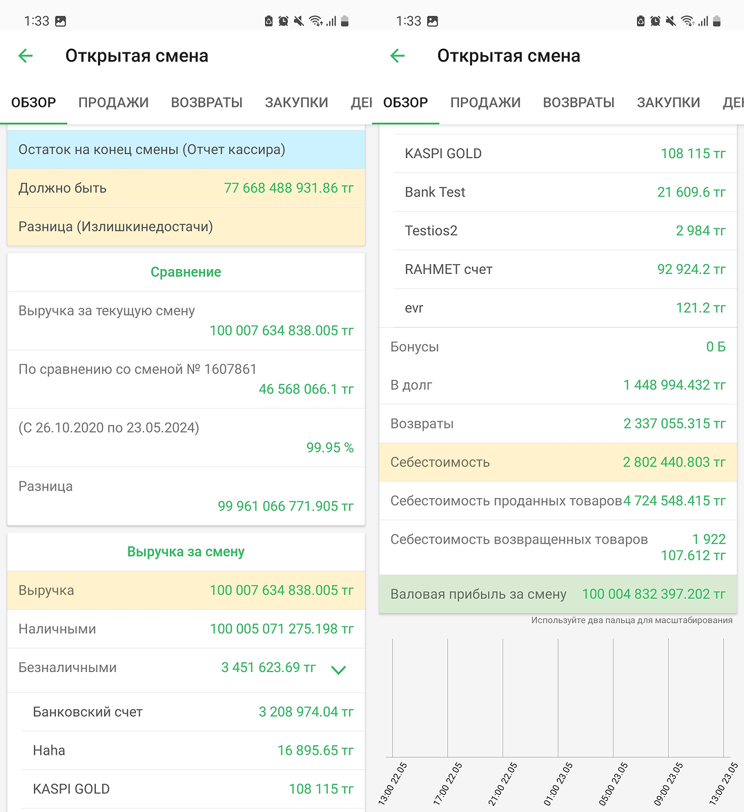 Прокрутив экран ниже вы увидите информацию о выручке за смену. Выручка - это деньги после вычета возвратов от продаж. Также указывается общая себестоимость товаров, разбивка на проданные и возвращенные товары, и общая валовая прибыль за смену.