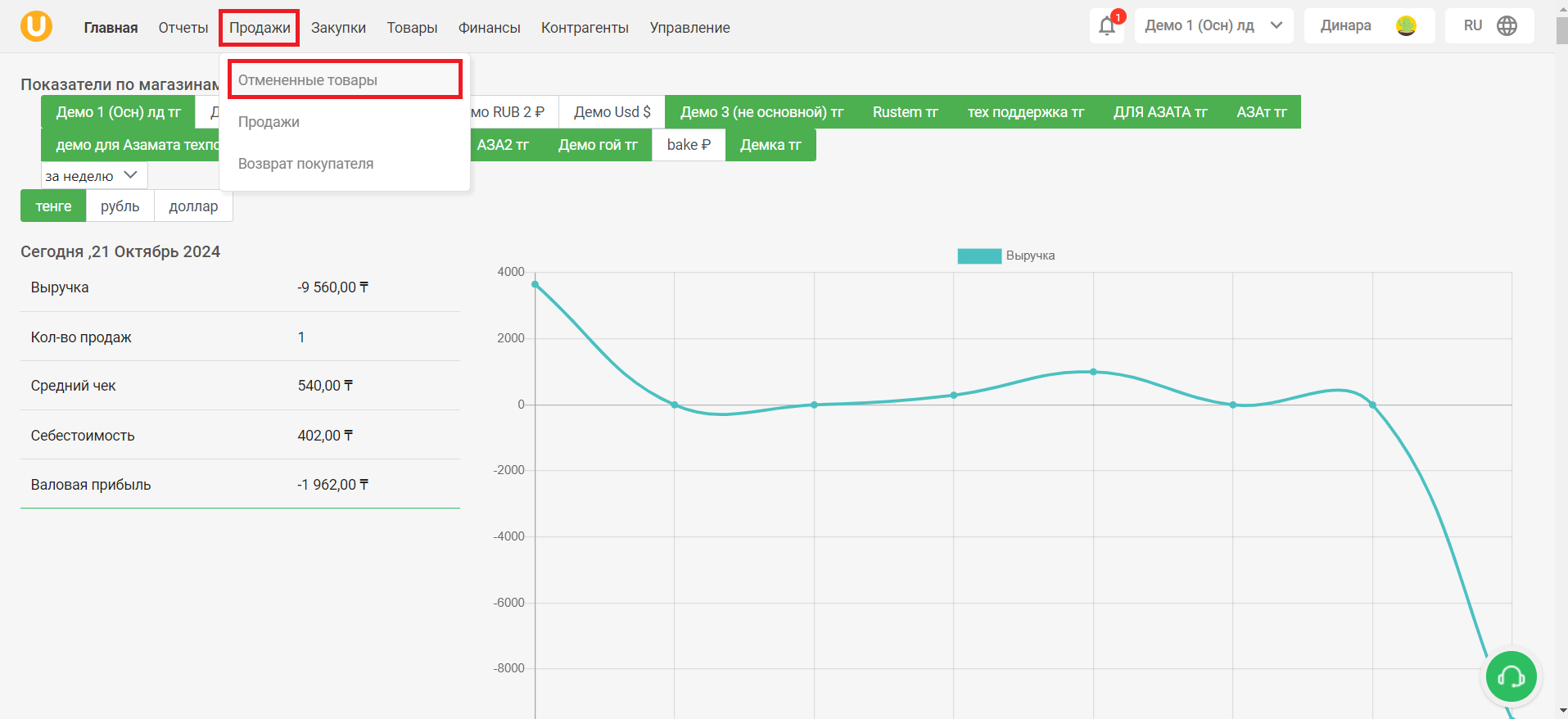 Для того, чтобы просмотреть отмененные товары, перейдите в раздел «Отмененные товары». Для этого на сайте Umag, со своего аккаунта, в верхнем меню выберите “Продажи” → “Отмененные товары”.