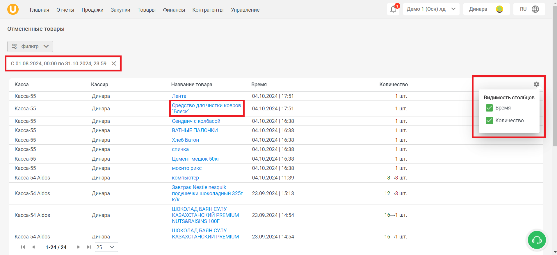 Примененные фильтры вы увидите в верхней части страницы. Вы можете отредактировать видимость столбцов таблицы, нажав на кнопку “⚙️” в правом верхнем углу таблицы. В таблице отмененных товаров указаны касса, на которой была совершена отмена, кассир, совершивший отмену, название отмененного товара, время отмены товара, а также количество отмененного товара.