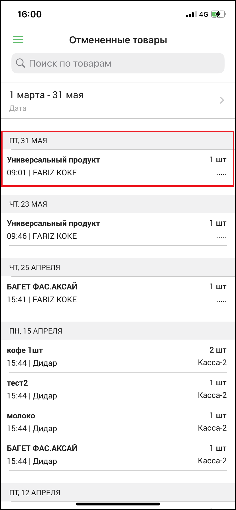 При удалении товара из списка продаж на кассе, товар появится в разделе “Отмененные товары” после синхронизации кассы с базой данных.