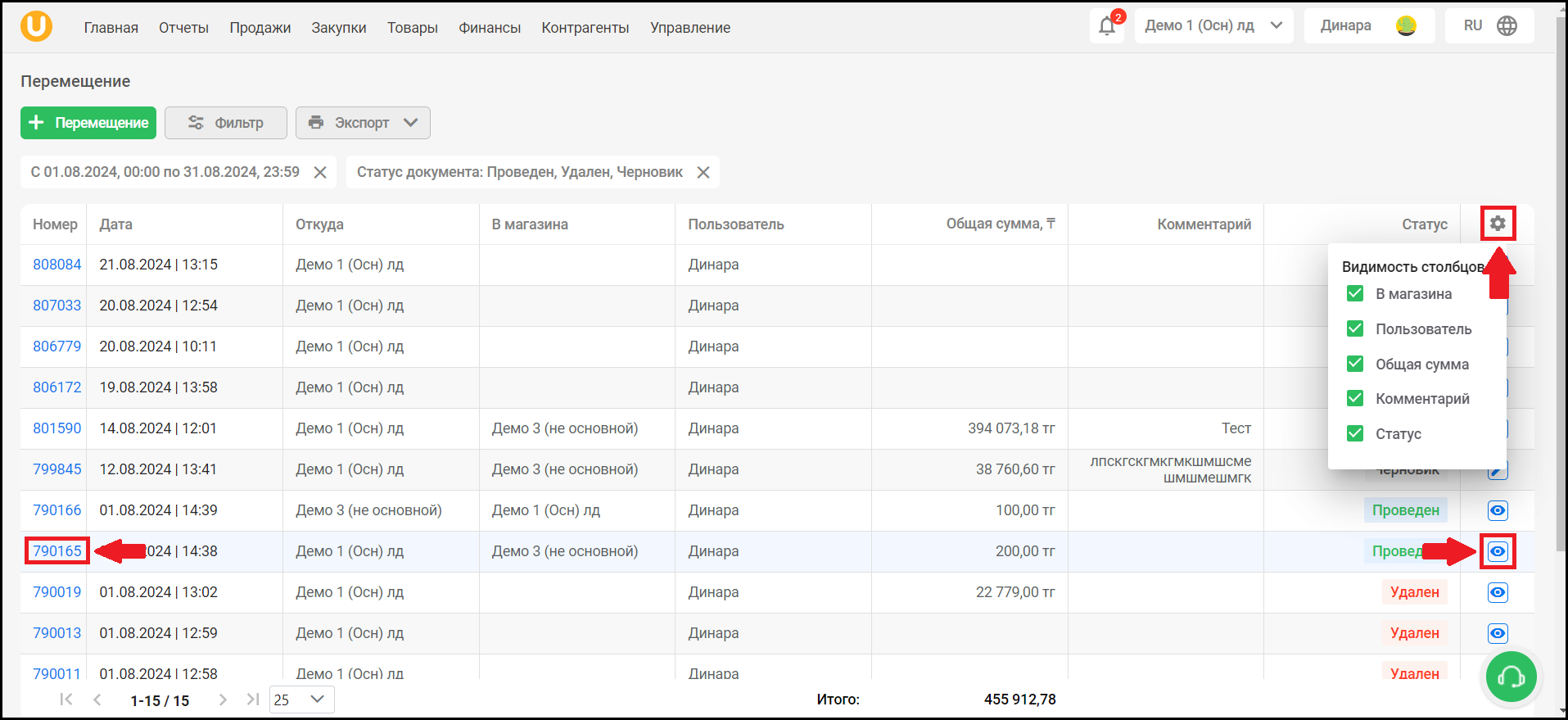 В таблице находится информация о совершенных перемещениях, нажмите на номер в первом столбце таблицы, либо на кнопки “✏️” или “👁️” напротив перемещения в таблице, чтобы открыть страницу редактирования перемещения. Нажав на кнопку “⚙️” в правом верхнем углу таблицы, вы можете редактировать видимость столбцов таблицы.