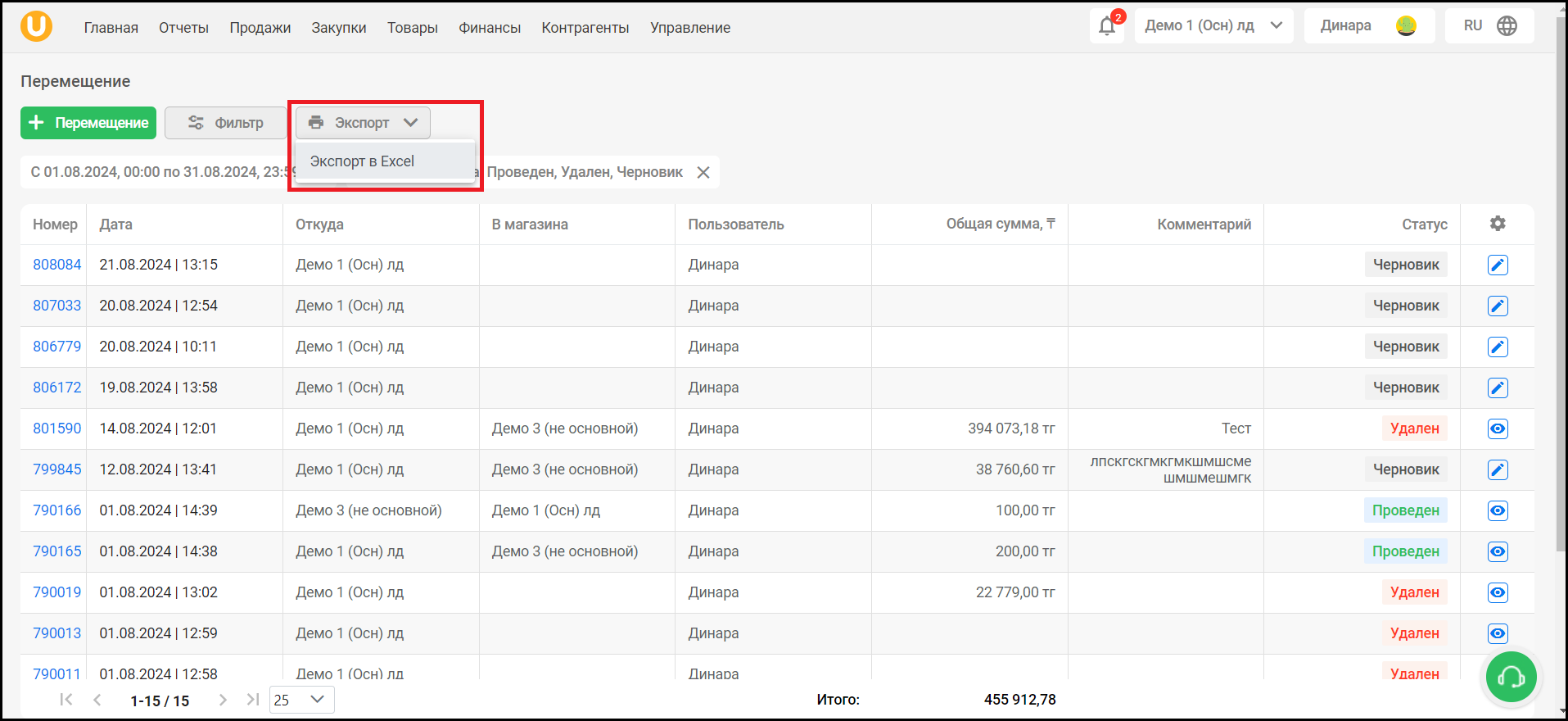 Для того, чтобы экспортировать данные по перемещениям, нажмите на “🖨️Экспорт” → “Экспорт в Excel”.