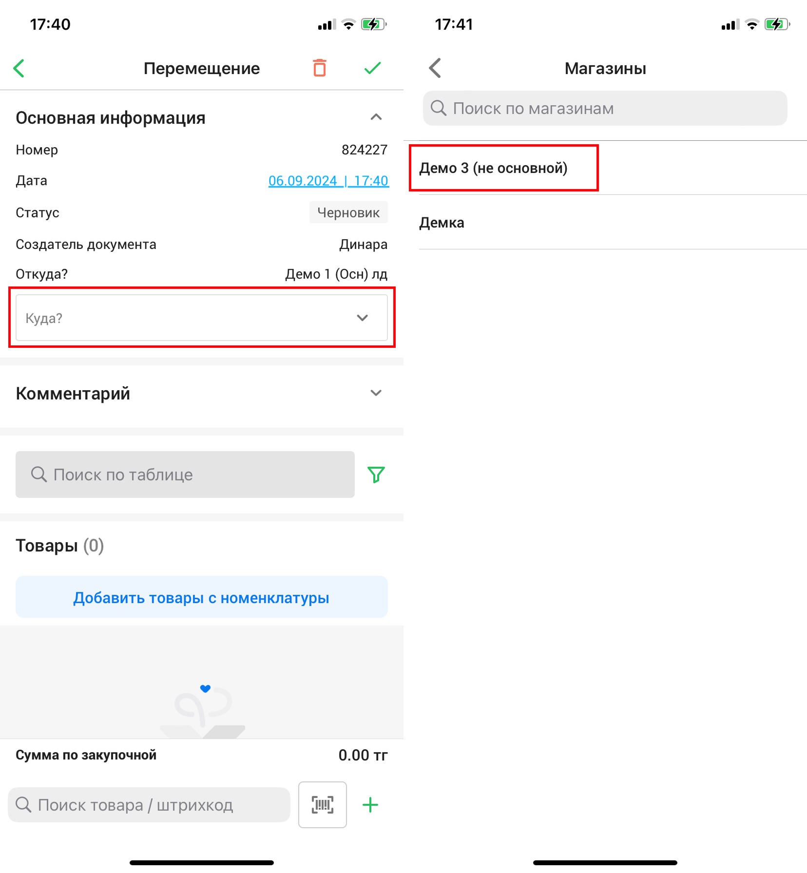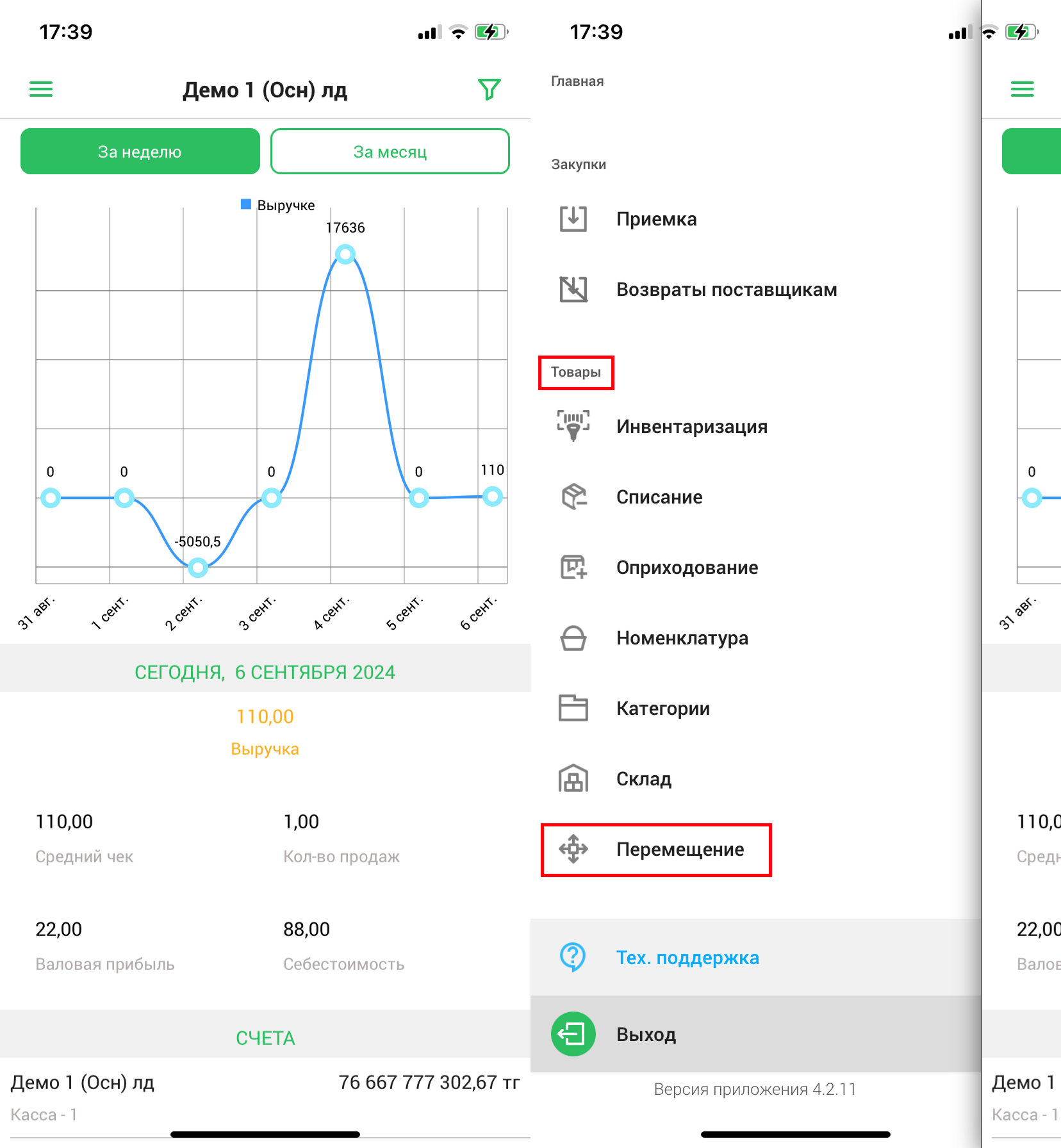 Для того, чтобы перейти в раздел “Перемещение”, откройте боковое меню, нажав на кнопку “≡”, дальше в боковом меню перейдите в раздел “Товары” → “Перемещение”