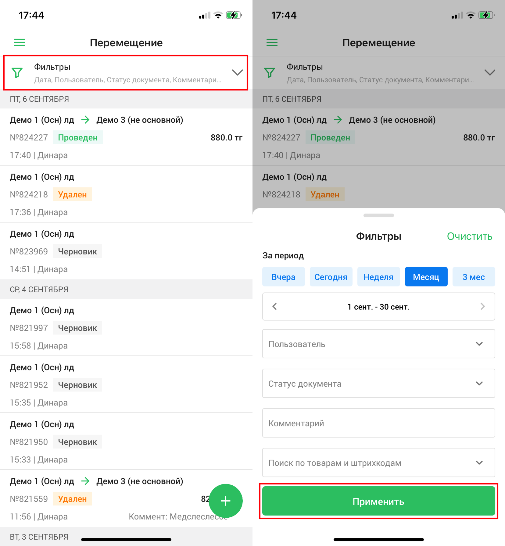 Нажмите на поле “Фильтры” в верхней части экрана, чтобы воспользоваться фильтром. Откроется окно “Фильтр”. В этом окне выберите период, за который вы хотите отображать перемещения, затем нажмите на кнопку “Применить”, чтобы применить фильтрацию. Примененный фильтр вы увидите в поле фильтра в верхней части экрана, а в списке перемещений будут отображаться только перемещения, подходящие к фильтру.