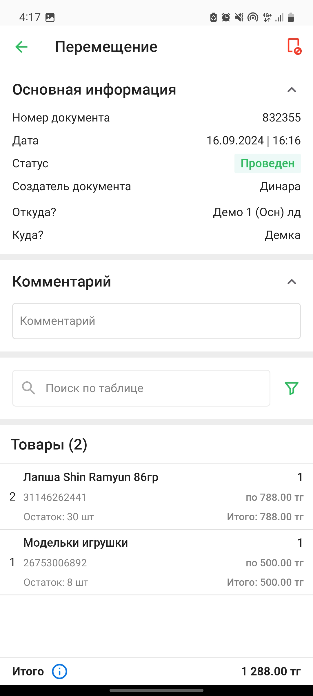 После внесения всех изменений, нажмите на кнопку “Провести”, чтобы создать перемещение товара.