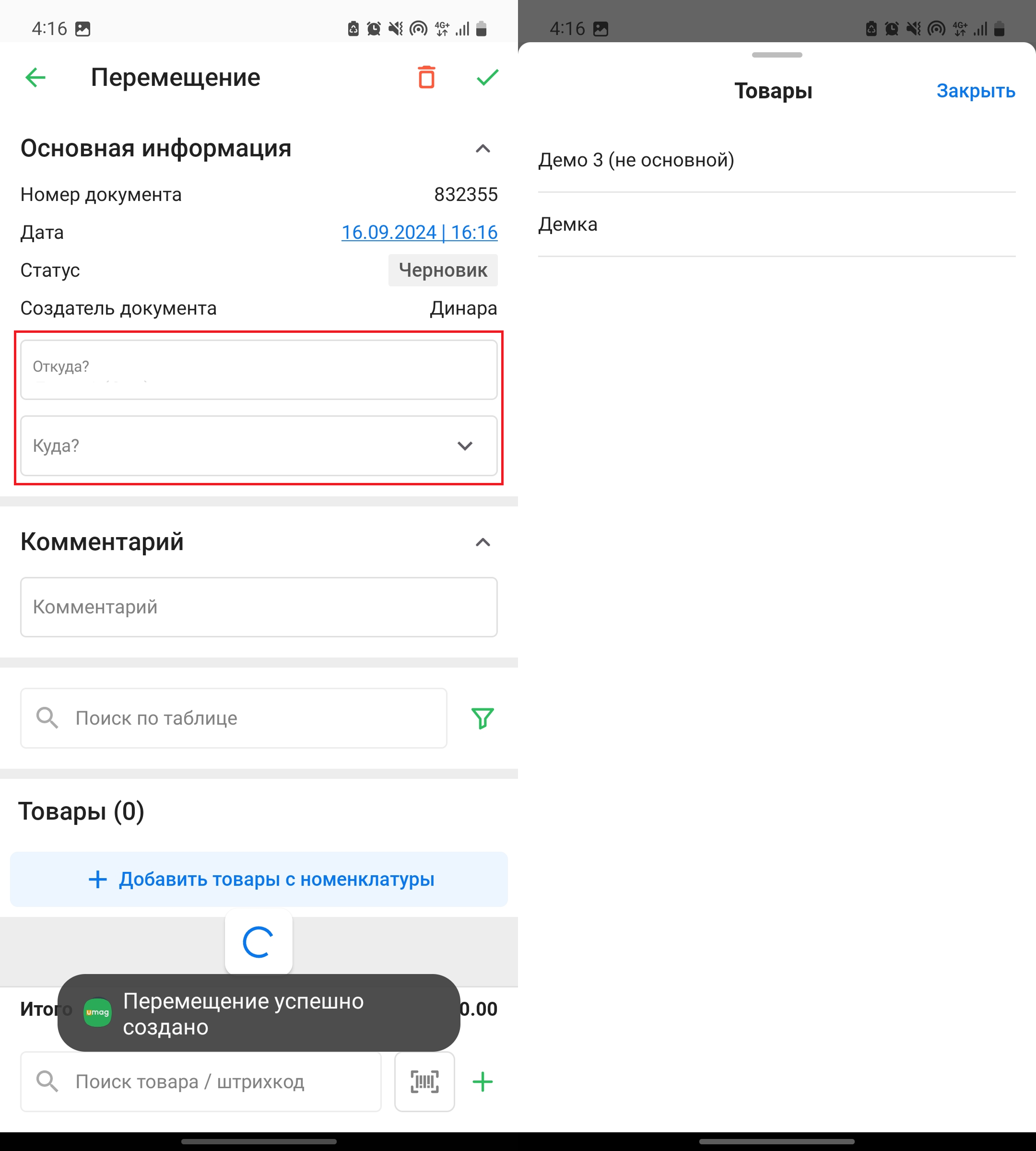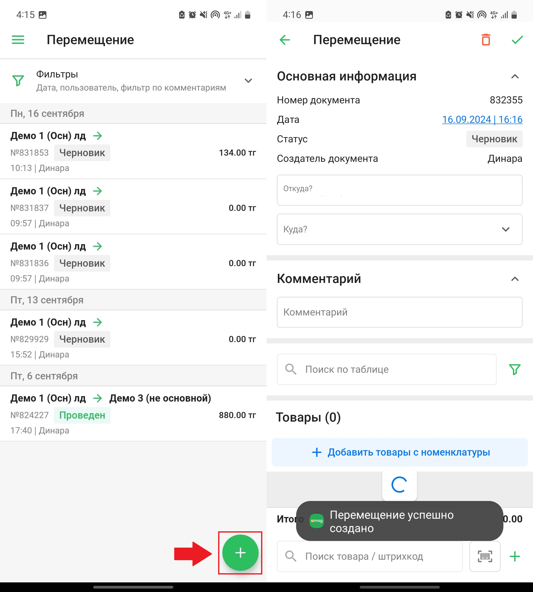 После того, как вы заполните необходимую информацию о перемещении, нажмите на кнопку “Добавить” в нижней части страницы, чтобы создать перемещение. Готово! При успешном создании перемещения, вы увидите его в списке перемещений, а также отобразится уведомление “✅Перемещение успешно создано”.
