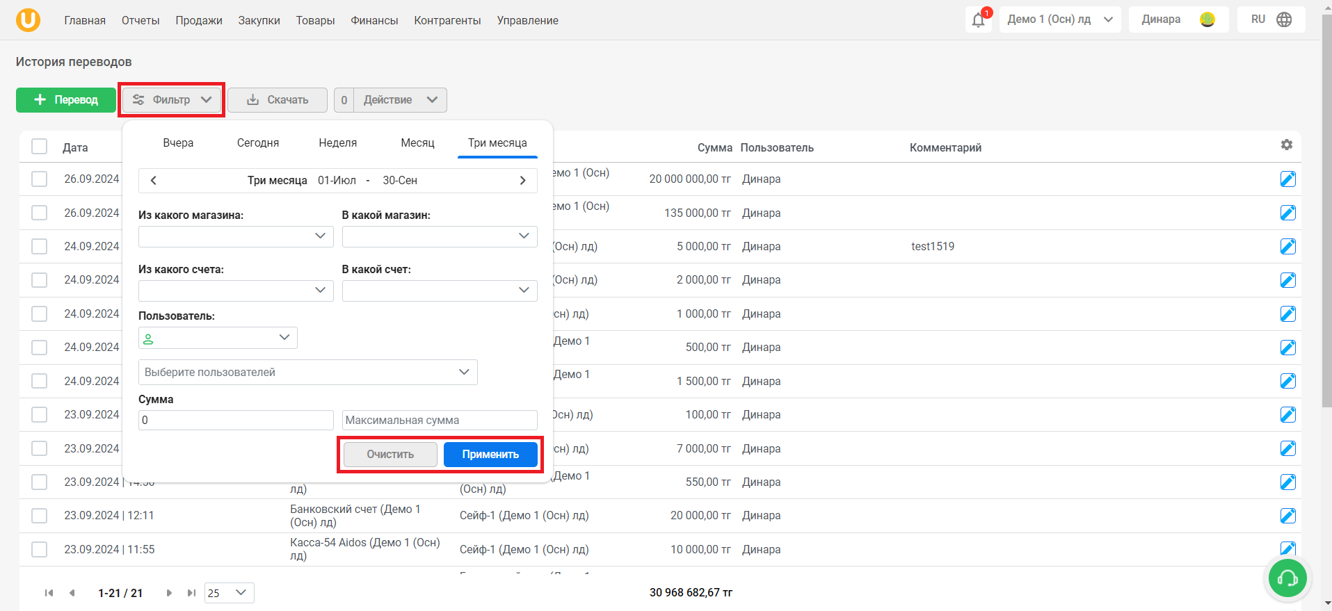 Нажмите на кнопку “Фильтр”, чтобы отфильтровать список так, как вам удобно. Нажмите на кнопку “Применить”, чтобы применить фильтр, либо нажмите на кнопку “Очистить”, чтобы очистить фильтр.