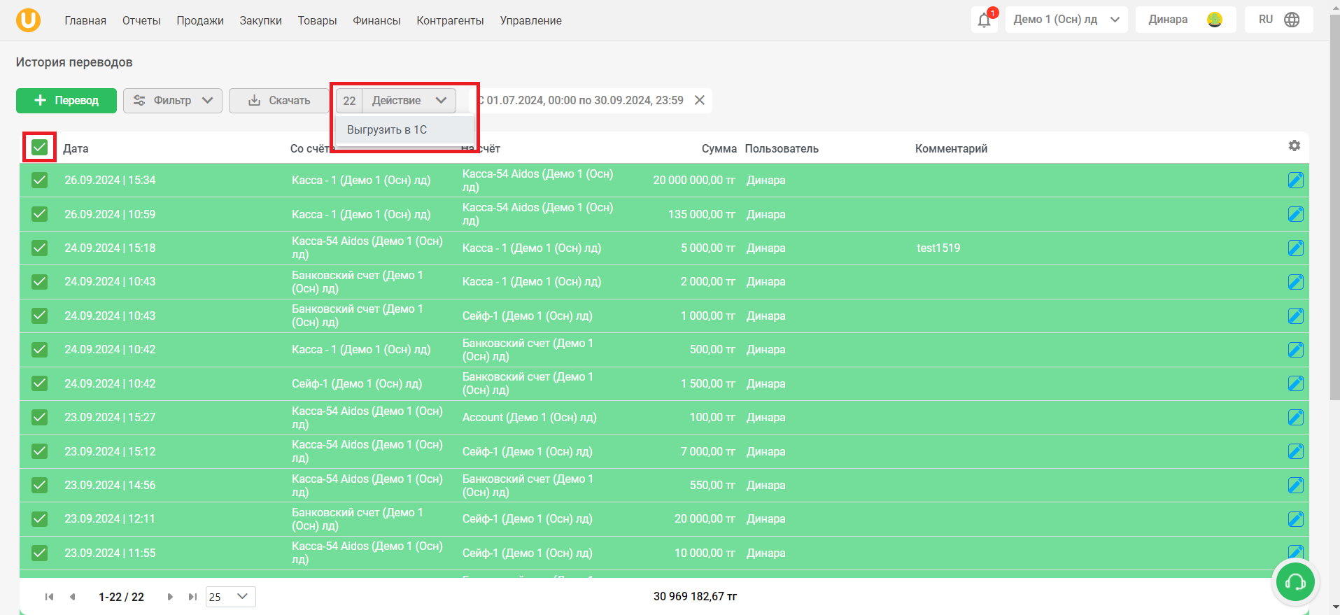 Откроется страница “История переводов”. На этой странице вы можете увидеть список совершенных переводов между счетами с подробной информацией - дата перевода, с какого счета и на какой счет был совершен перевод, на какую сумму был совершен перевод, пользователь, совершивший перевод, а также комментарий к переводу. Также, вы можете создать новый перевод, использовать фильтры, скачать данные и выгрузить их в 1С.