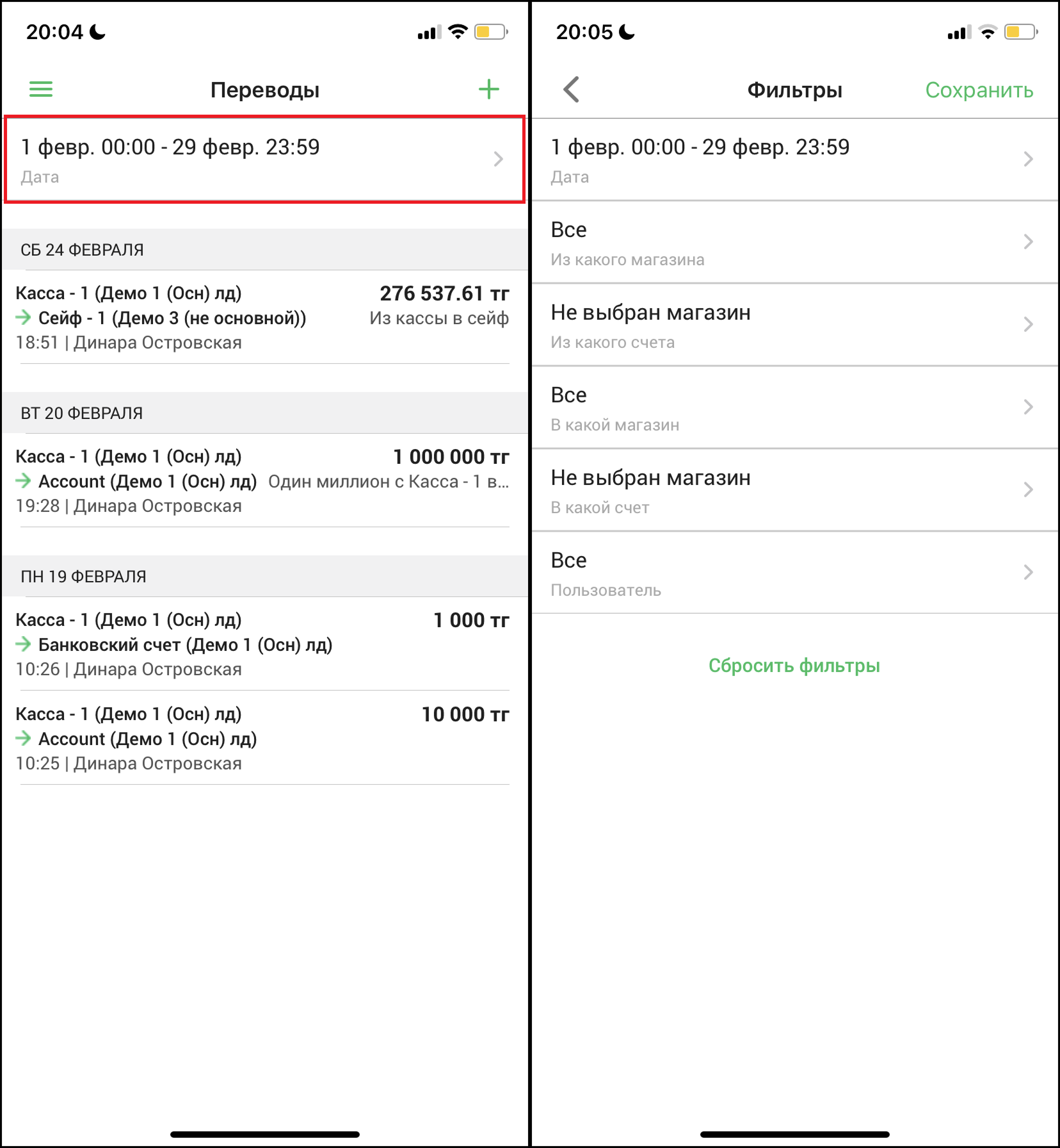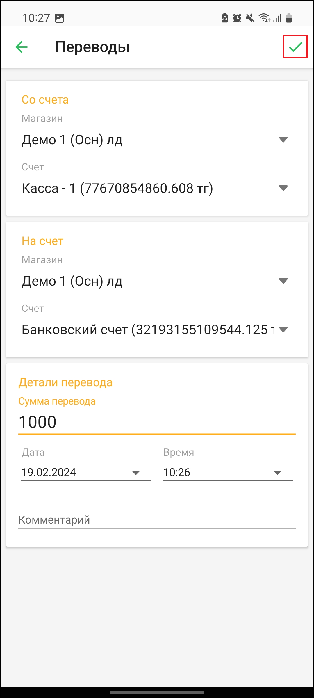 Откроется страница “Создание перевода”. Заполните необходимые данные - из какого магазина, из какого счета будет совершен перевод, в какой магазин, на какой счет поступят средства. Введите сумму перевода, а также время перевода. При необходимости, вы можете оставить комментарий в поле “Комментарий”. После заполнения всех данных, нажмите на кнопку “✅”, чтобы создать перевод.