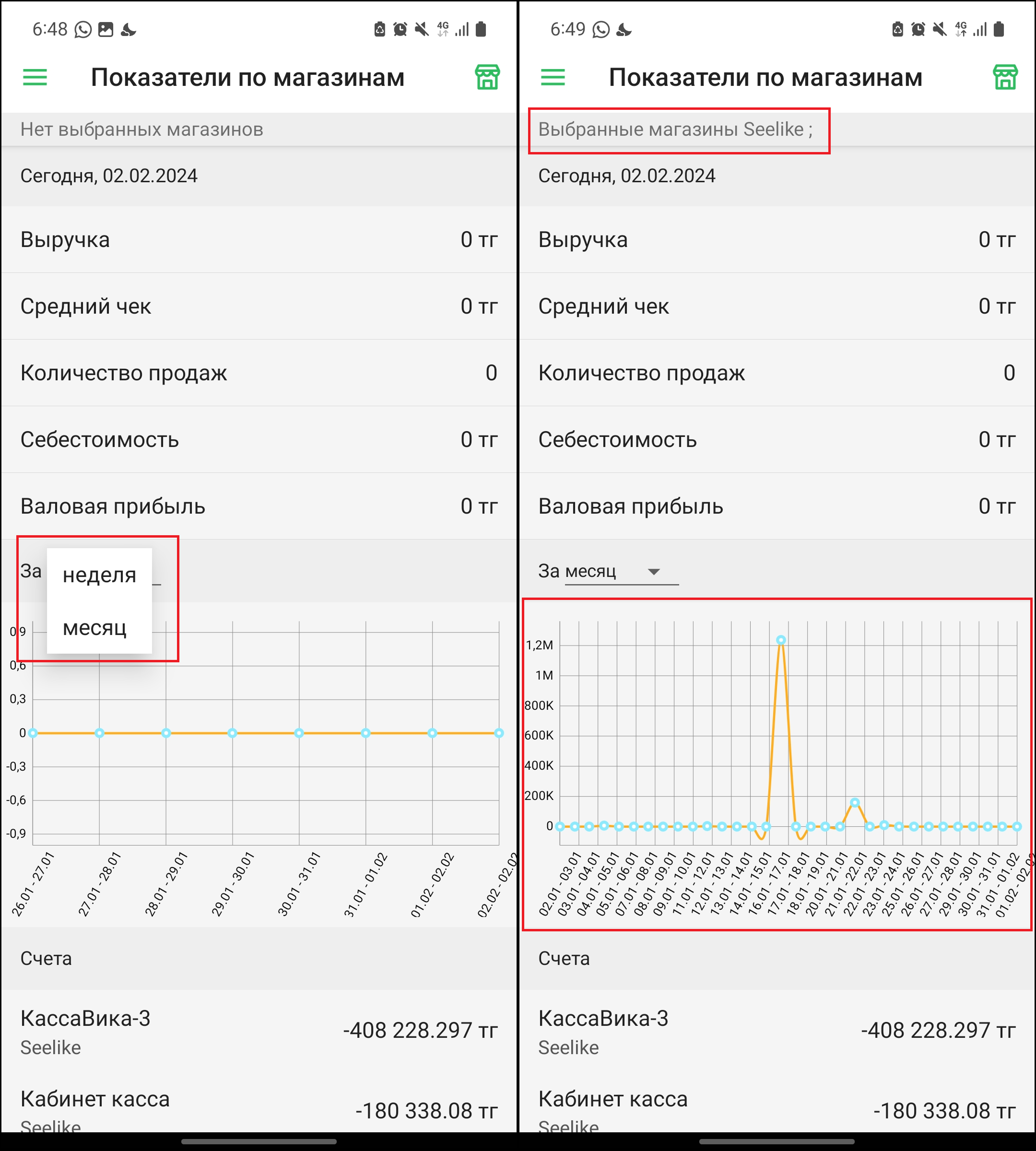 Выберите период, за который вы хотите вывести график, нажав на поле “За период” над самим графиком. Выбранные магазины вы увидите в верхней части страницы. В графике выручки вы увидите выручку за определенный период, а также сумму выручки за каждый отдельный день.