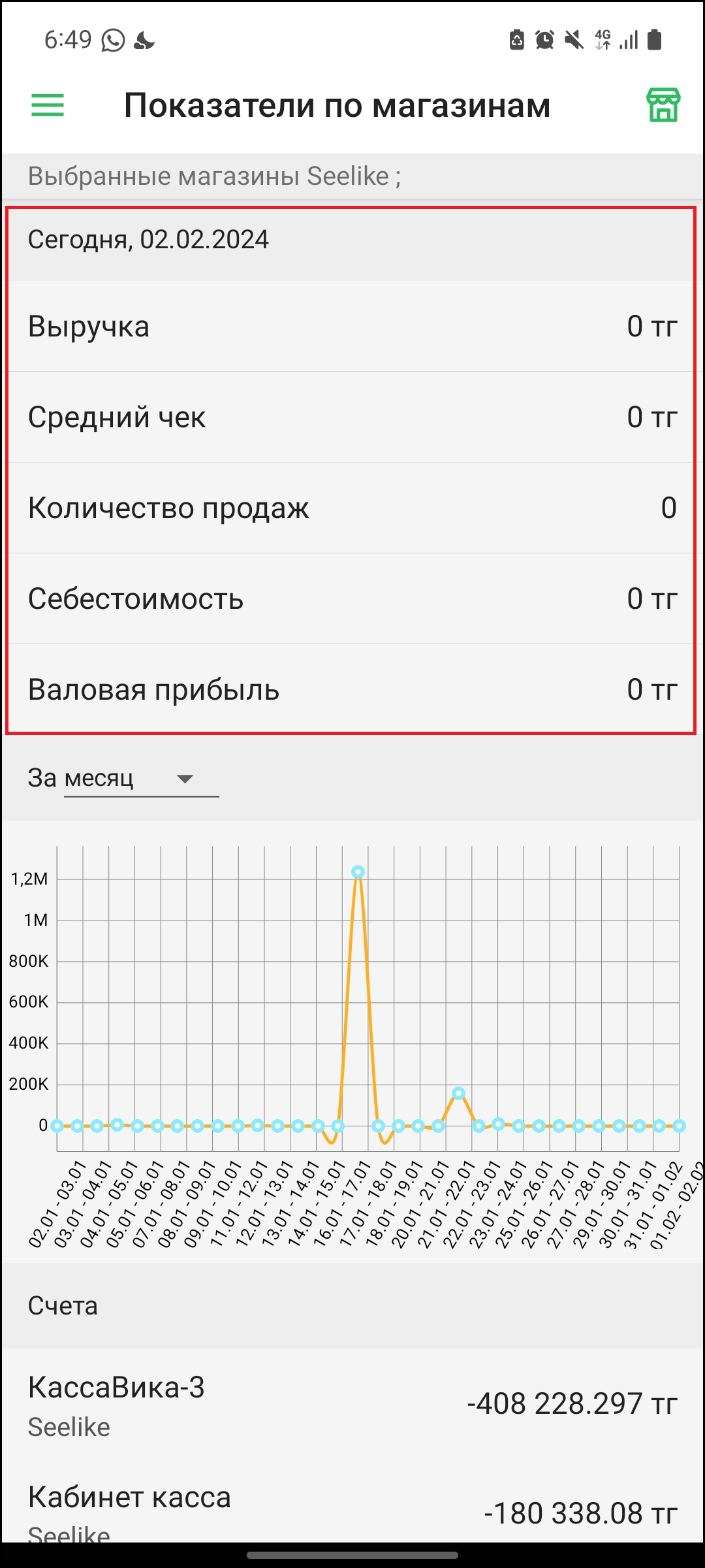 На этой странице вы можете увидеть статистику за день - выручку, количество продаж, средний чек, себестоимость и валовую прибыль.