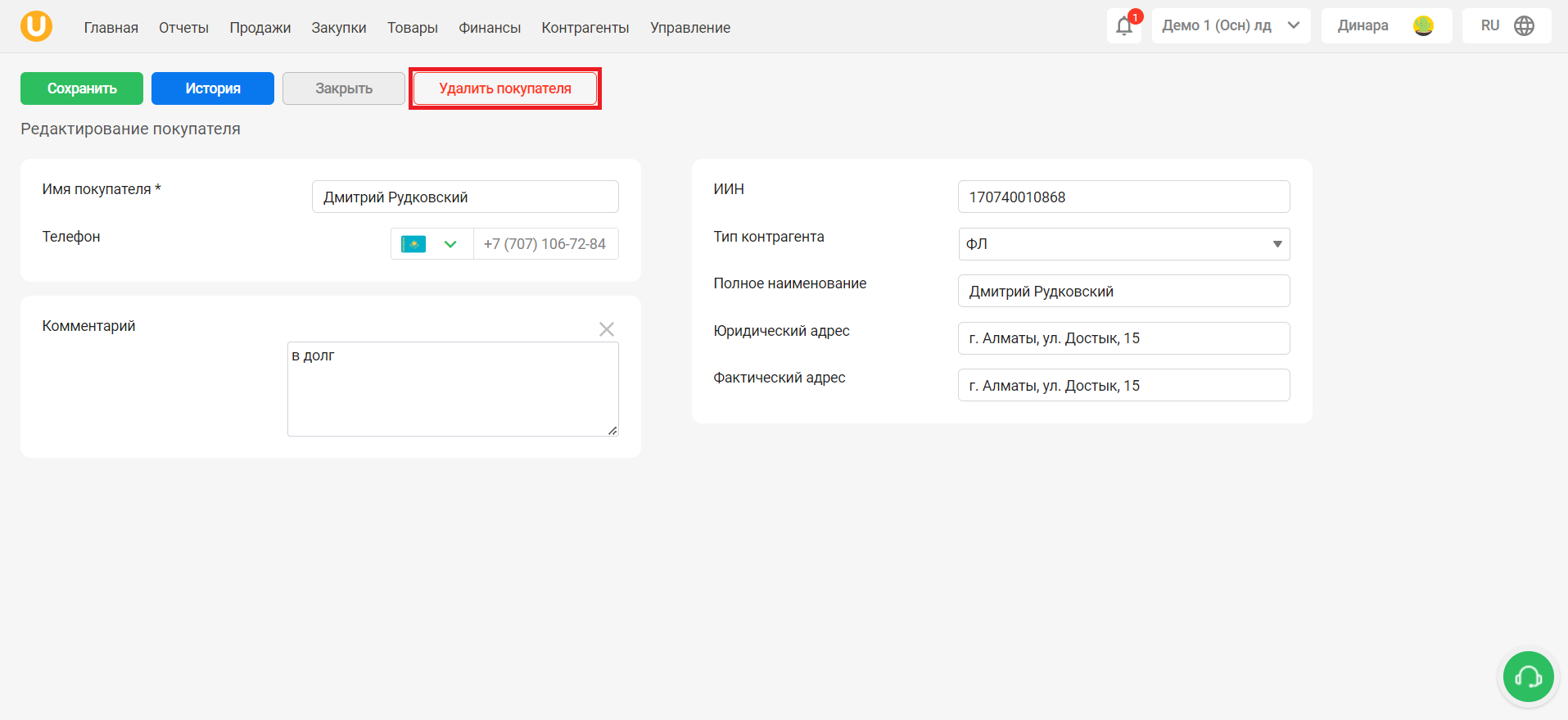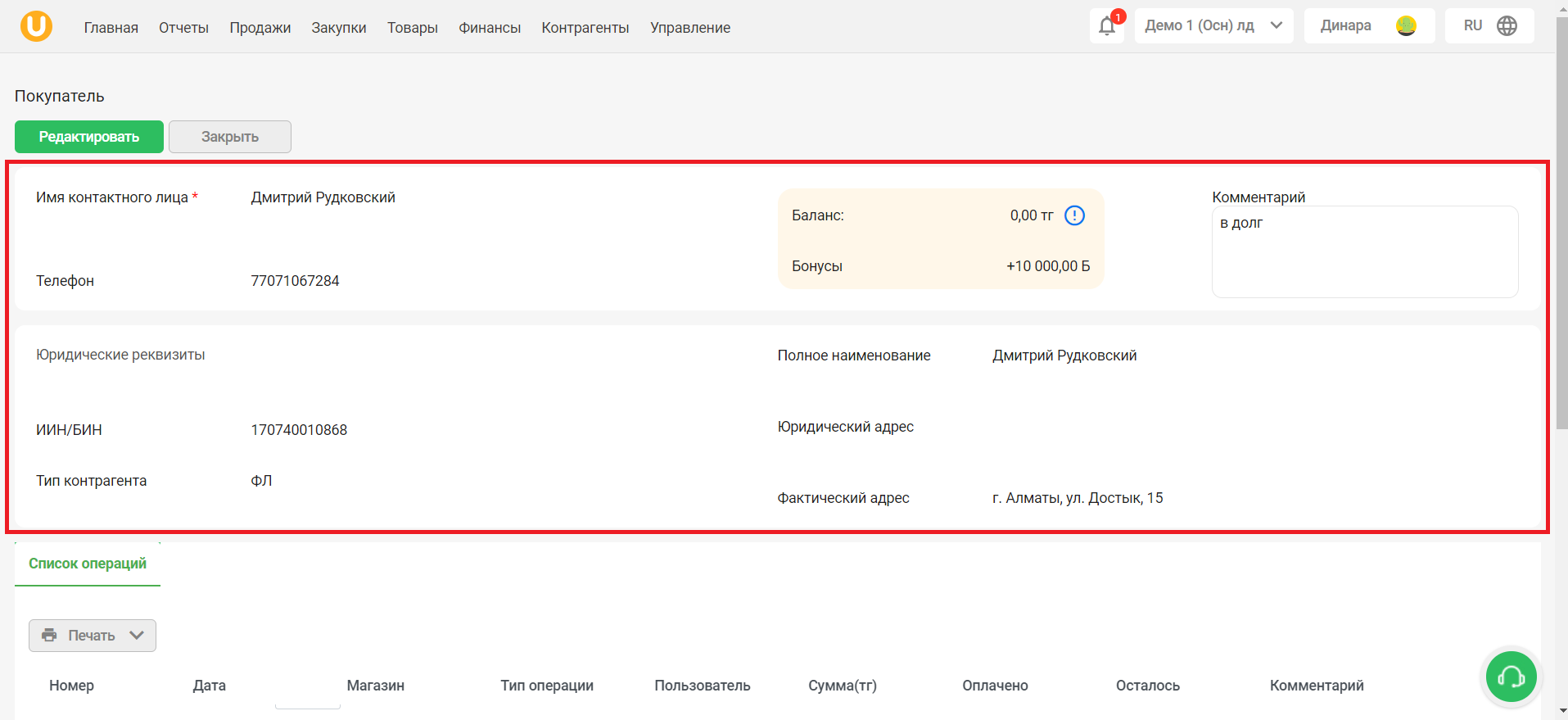Откроется страница “Покупатель”, где вы можете найти полную информацию о покупателе - имя контактного лица, телефон, баланс, бонусы. Вы можете оставить комментарий в поле “Комментарий” в правой верхней части страницы. Также, вы можете найти юридические реквизиты покупателя - ИИН/БИН, тип контрагента, полное название, юридический и физический адреса.