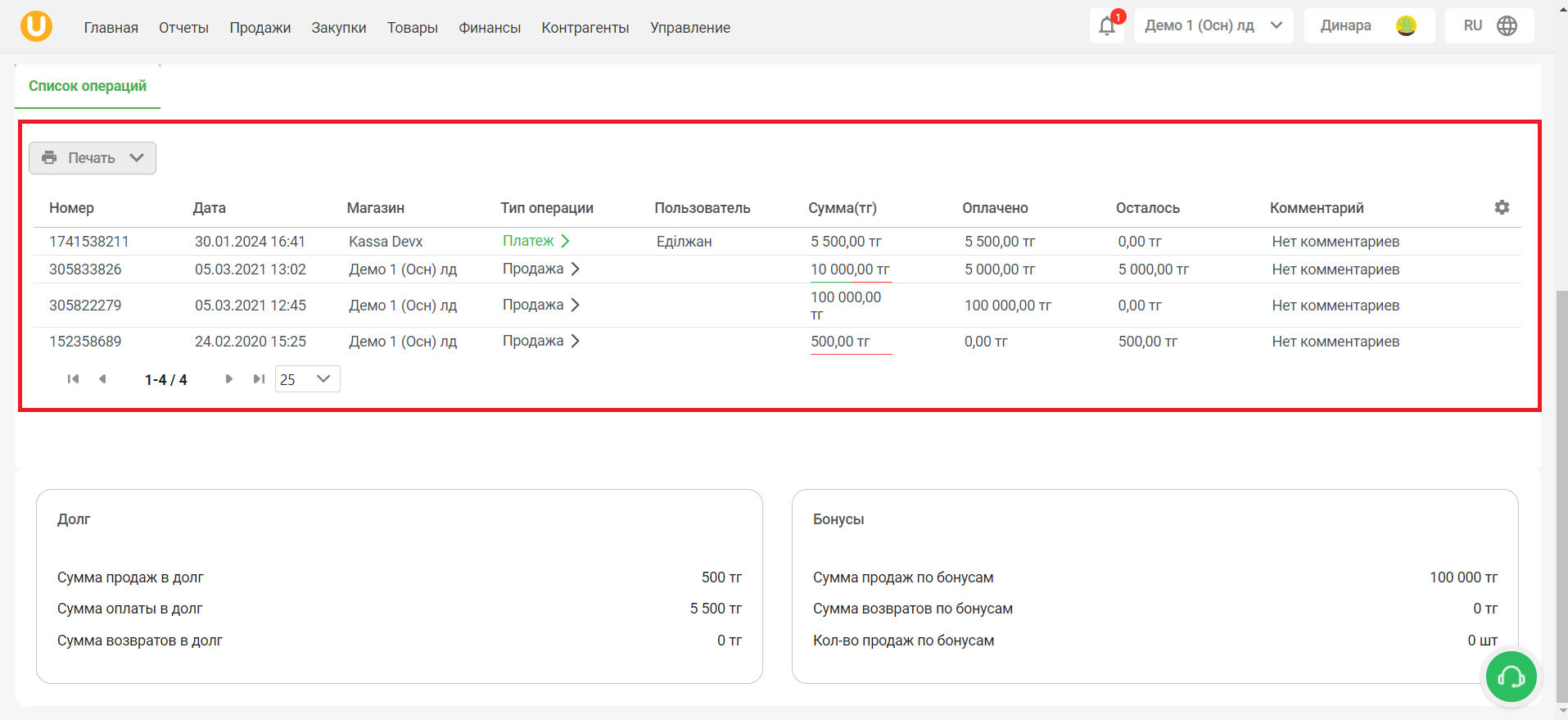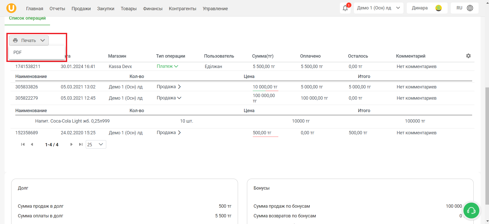Вы можете распечатать список операций покупателя, нажав на кнопку “🖨️Печать” → “PDF” в левом верхнем углу страницы.