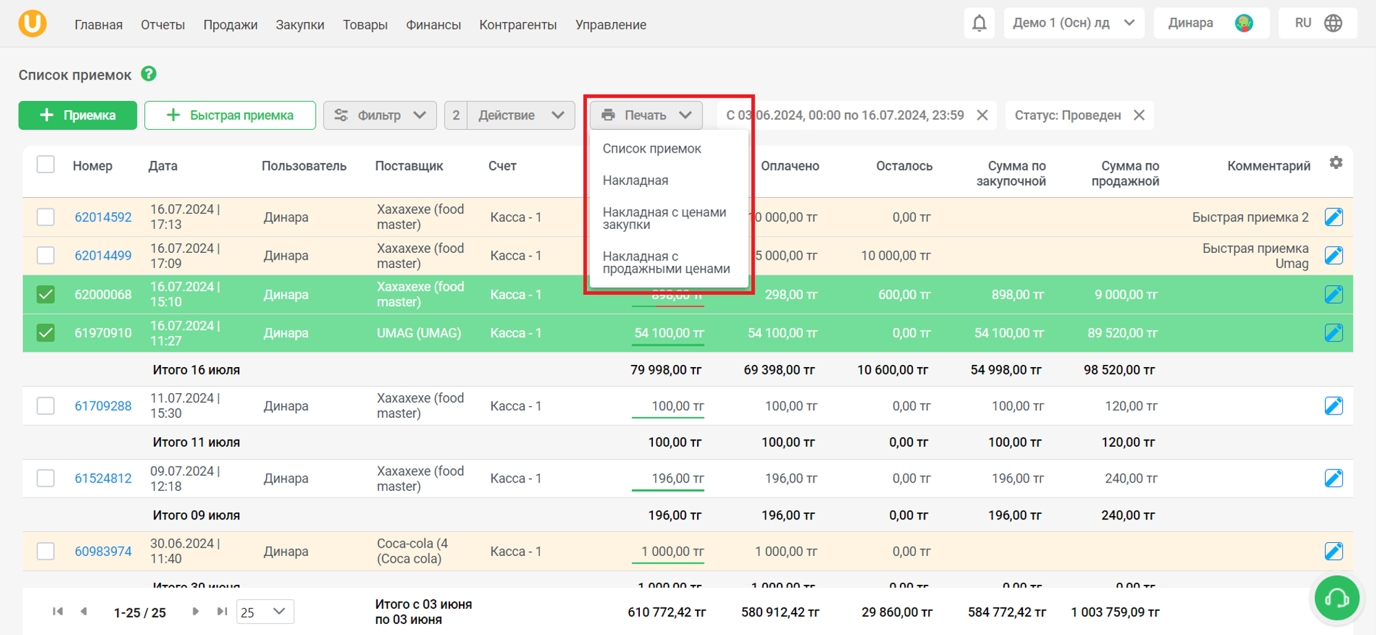 Список приемок содержит в себе информацию о приемках - номер, дата приемки, пользователь, совершивший приемку, поставщик, счет, сумма приемки, оплаченная и оставшаяся сумма, сумма по закупочной/продажной цене, а также комментарий к приемке. Черновики документов приемки помечены серым цветом, а проведенные приемки помечены синим цветом.