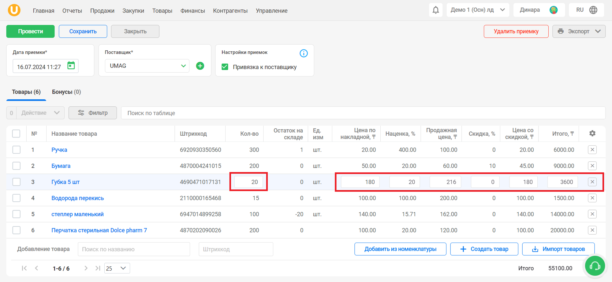 Добавленные товары вы увидите в списке, в котором вы можете отредактировать количество, цены, наценку, скидку. Нажмите на кнопку “❌” напротив товара, чтобы удалить его из списка.