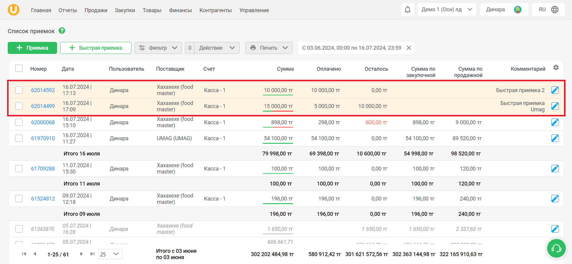 При успешном создании быстрой приемки вы увидите его в списке. Остаток неоплаченной суммы приемки, проведенной под консигнацию, помечается в списке в столбце “Осталось”.