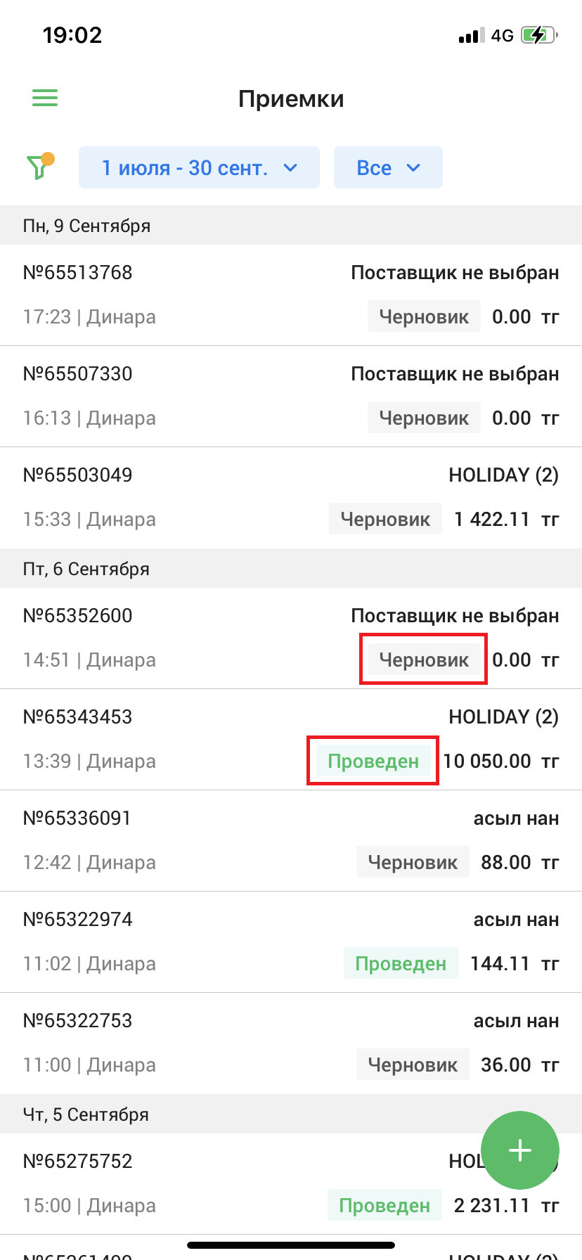 Список приемок содержит в себе информацию о приемках - дата и время, поставщик, сумма приемки и статус документа. Черновики документов приемки помечены тегом ”Черновик”, проведенные приемки помечены тегом “Проведен”, оформленные в консигнацию приемки помечены тегом “Проведен” с указанием остатка при неполной выплате суммы приемки.