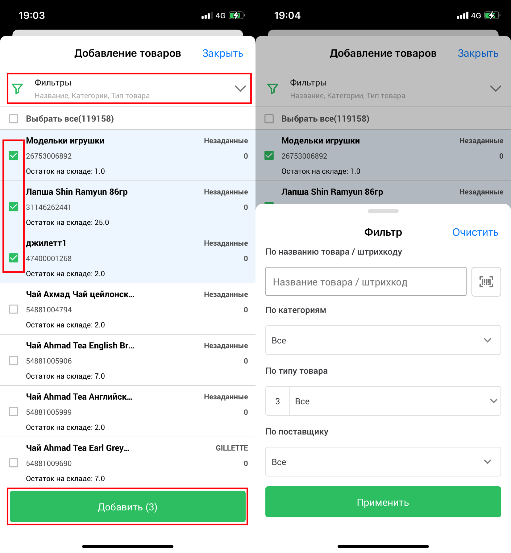 Для того, чтобы добавить товары из номенклатуры, нажмите на кнопку “Добавить товары” в нижней части экрана. Откроется окно “Добавление товаров”. Нажмите на поле “Фильтры”, чтобы настроить фильтр. Нажмите на необходимый вам товар, чтобы добавить его в приемку. Затем, нажмите на кнопку “Добавить”, чтобы добавить выбранные товары в приемку.