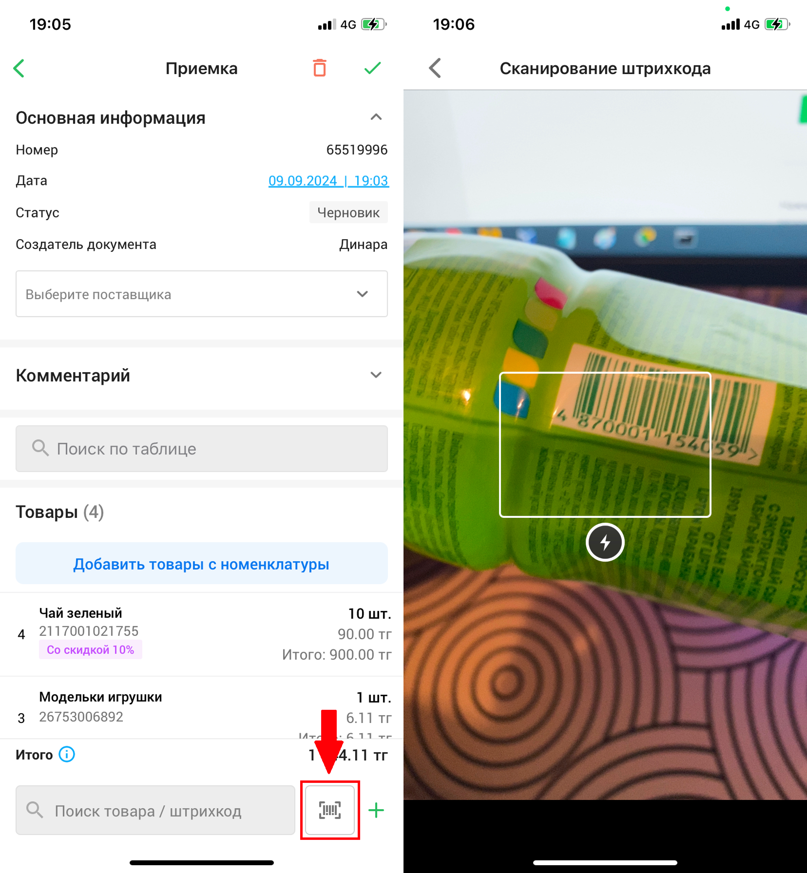 Для того, чтобы добавить товары с помощью сканирования штрихкода, нажмите на кнопку сканирования штрихкода. Отсканируйте штрихкод товара, чтобы добавить его в приемку.