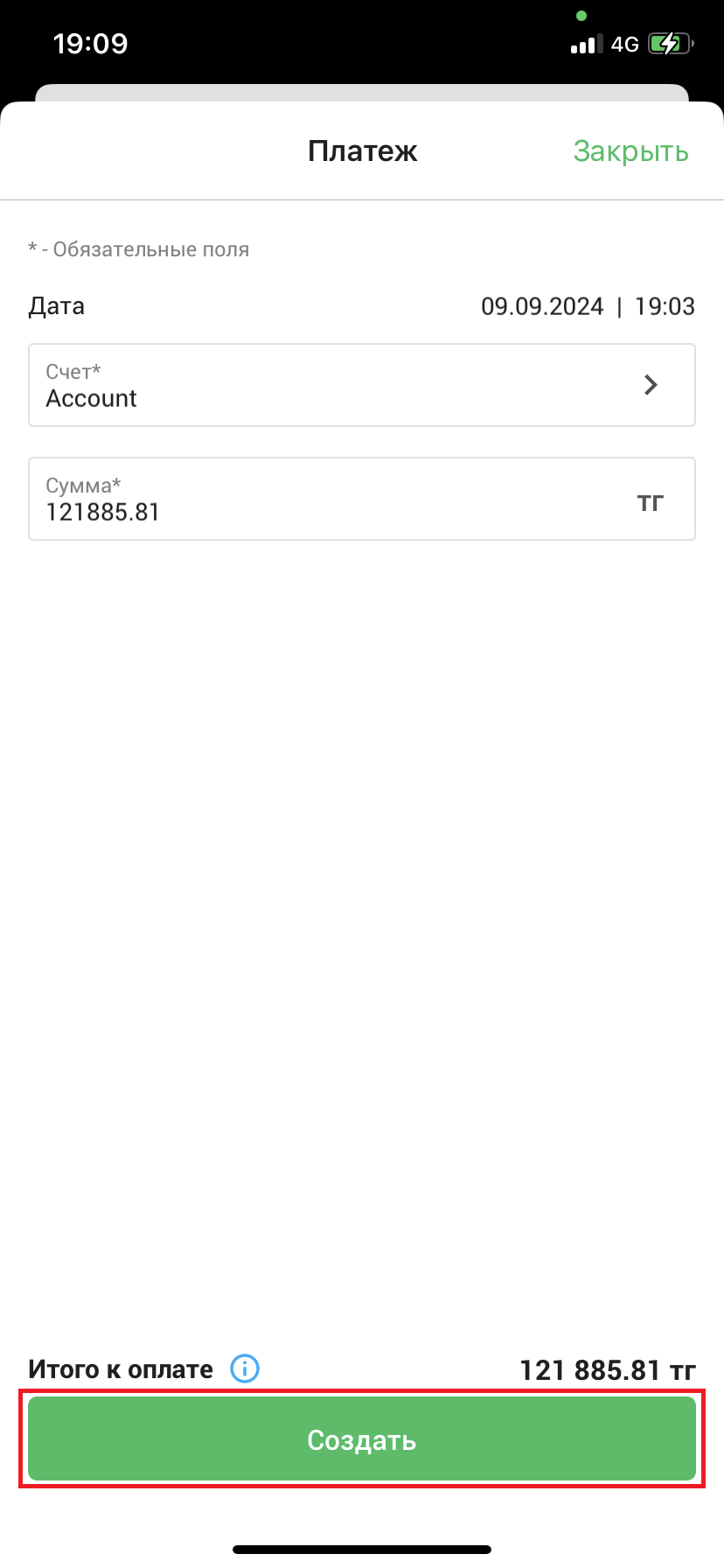 При проведении документа откроется страница “Платеж”. Выберите счет, через который будет проведена приемка и введите сумму, затем нажмите на кнопку “Создать” в нижней части экрана, чтобы создать платеж по приемке.