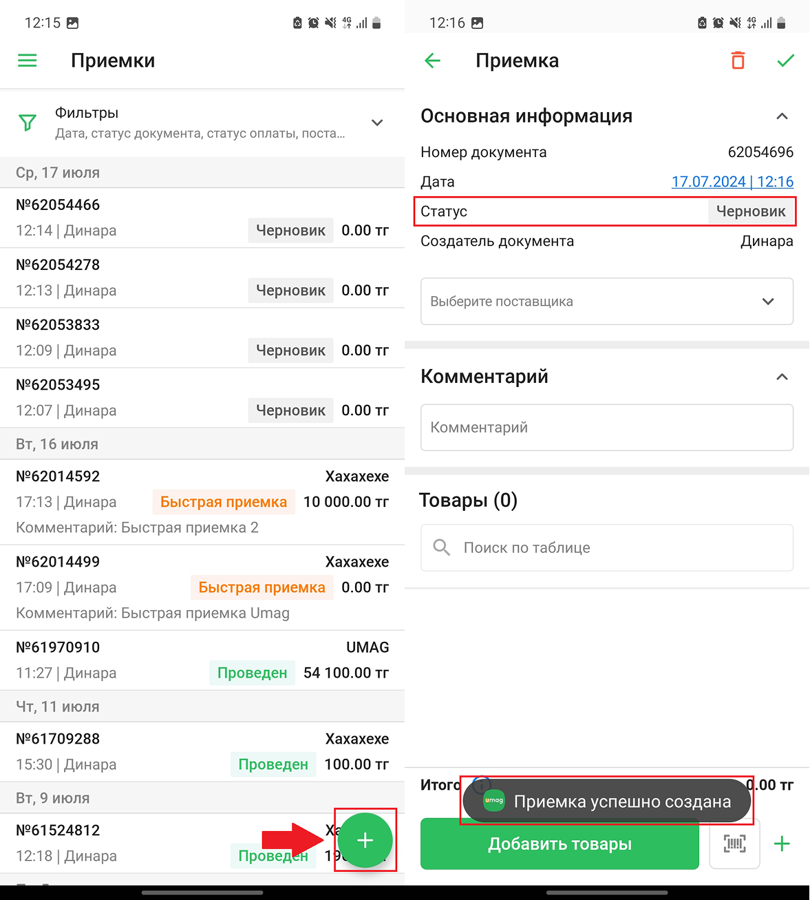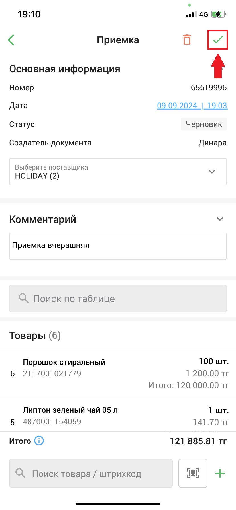 Все добавленные товары вы увидите в списке во вкладке “Товары”. Нажмите на кнопку “✅” в правом верхнем углу экрана, чтобы провести/сохранить приемку. Во всплывающем окне нажмите на кнопку “Провести”, чтобы провести документ приемки, либо нажмите на кнопку “Сохранить”, чтобы сохранить документ приемки как черновик.