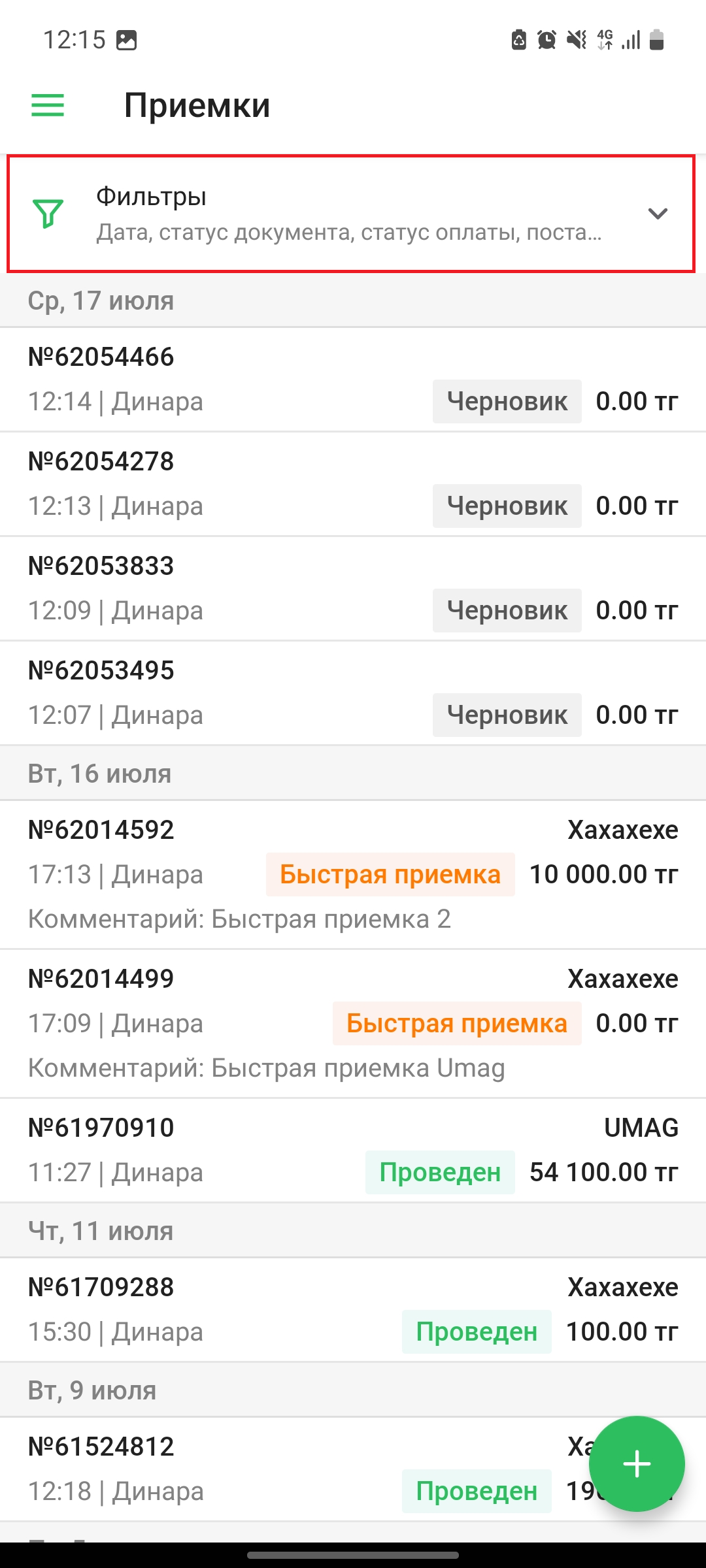 Список приемок содержит в себе информацию о приемках - дата и время, номер приемки, сумма приемки, пользователь, поставщик, статус документа и комментарий. Черновики документов приемки помечены тегом ”черновик”, проведенные приемки помечены тегом “Проведен”, быстрые приемки помечены тегом “Быстрая приемка”.