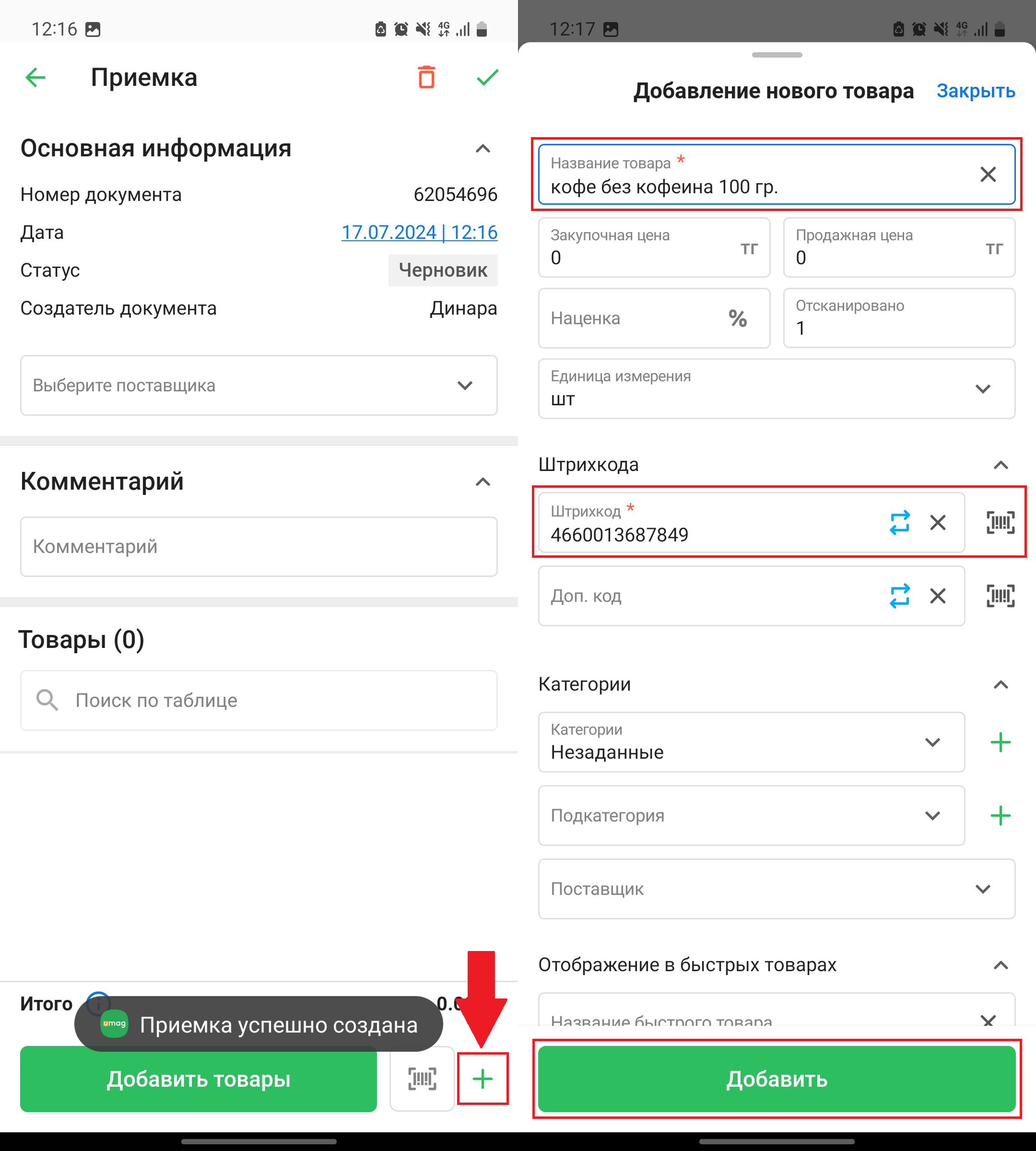 Нажмите на кнопку “➕” в правом нижнем углу страницы, чтобы создать новый товар и добавить его в приемку. Откроется окно “Добавление нового товара”. Заполните обязательные поля (название товара, штрихкод) и нажмите на кнопку “Добавить” в нижней части окна, чтобы добавить товар в приемку.